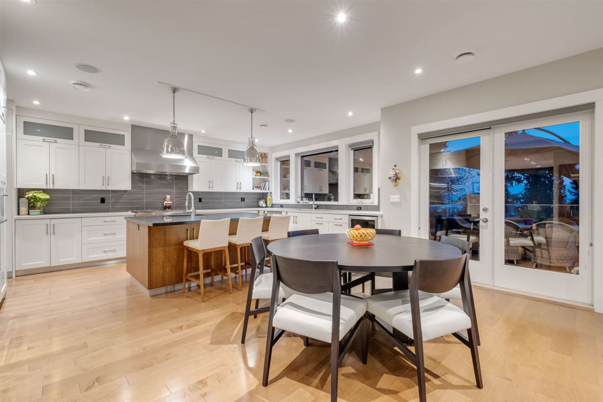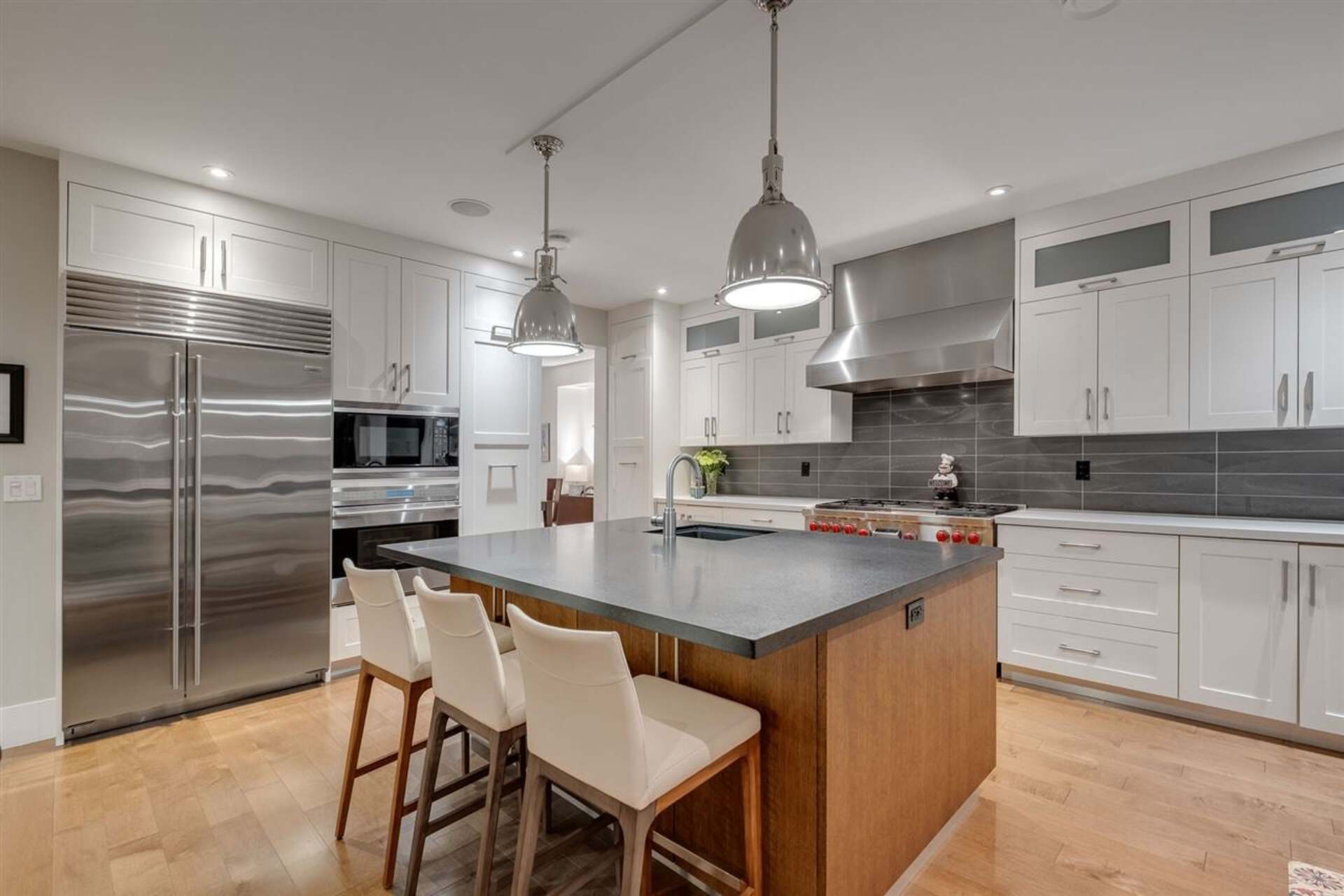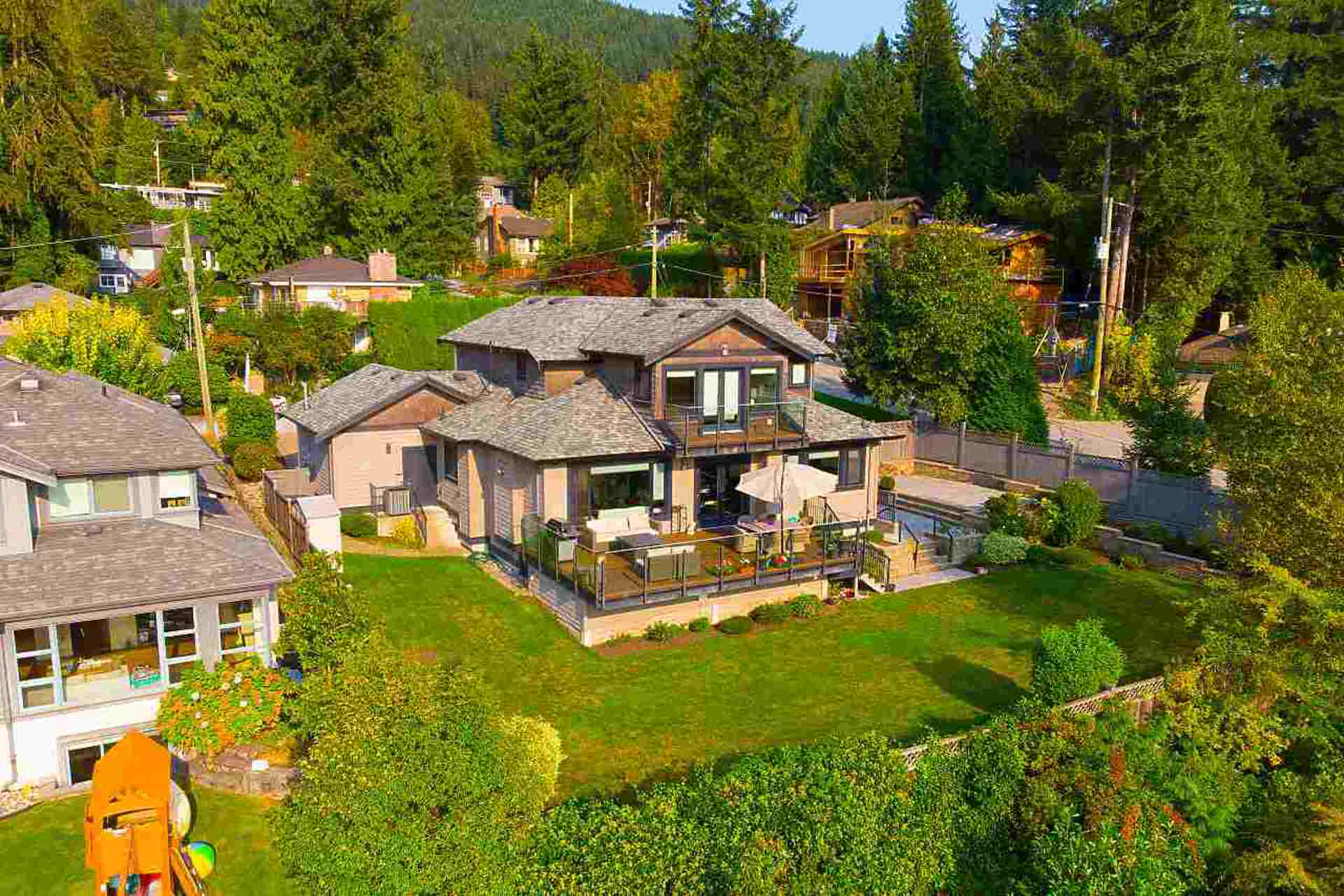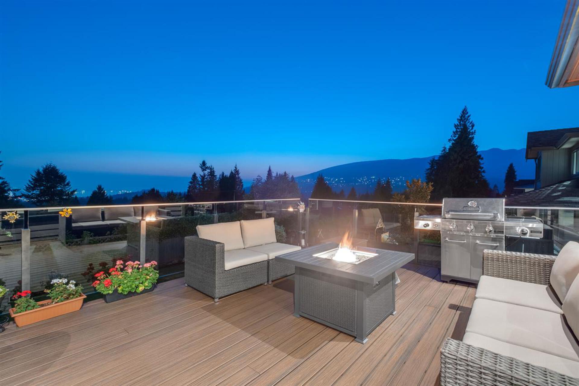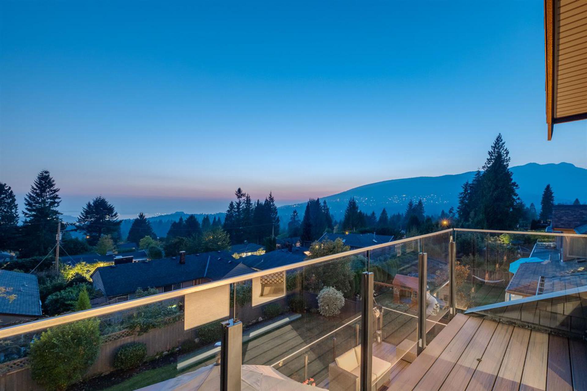 Located in one of Edgemont's most prestigious neighbourhoods, this custom-built home is both unique and beautiful in its' design. This one-of-a-kind property is situated on an oversized 9,900 sqft corner lot that offers views of the ocean and mountains. From the moment you step into this property, the exceptional floor plan, modern smart home technology, custom millwork, maple hardwood floors, honed granite, and quartz counters represent the exemplary quality and design this home offers. The impressive main level provides a formal living and dining area, a private office, a spectacular great room and gourmet kitchen that unfold onto a large outdoor deck with an inviting fire pit. The south facing back yard is bright, flat, spacious, and an entertainer's dream.