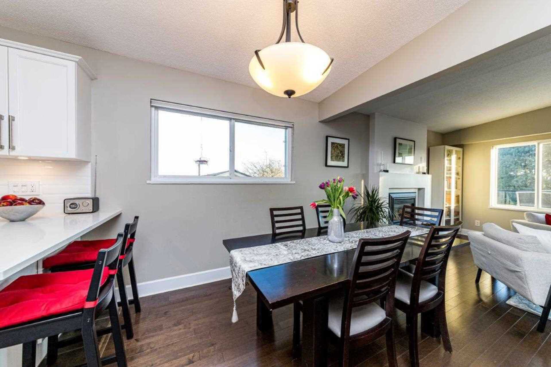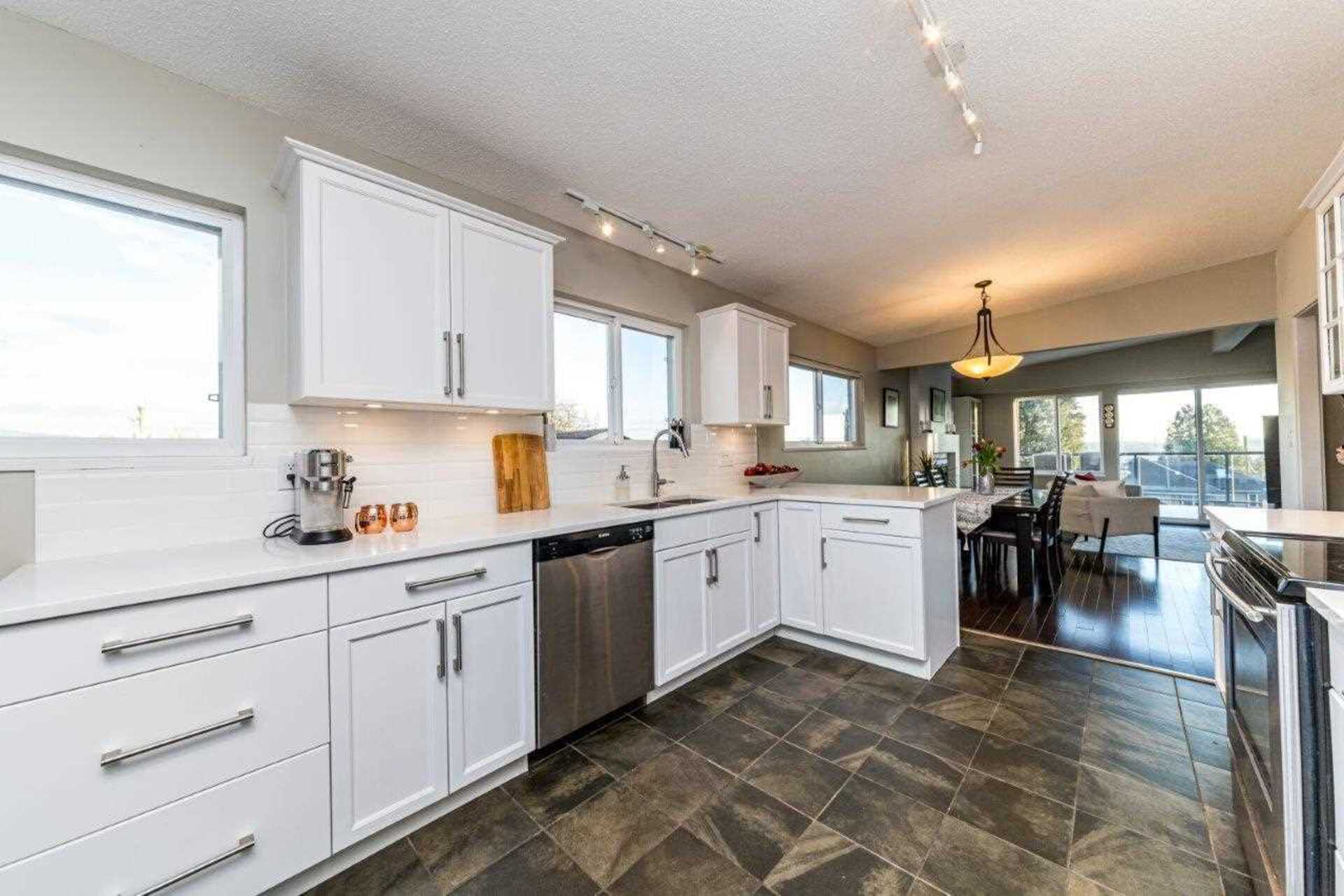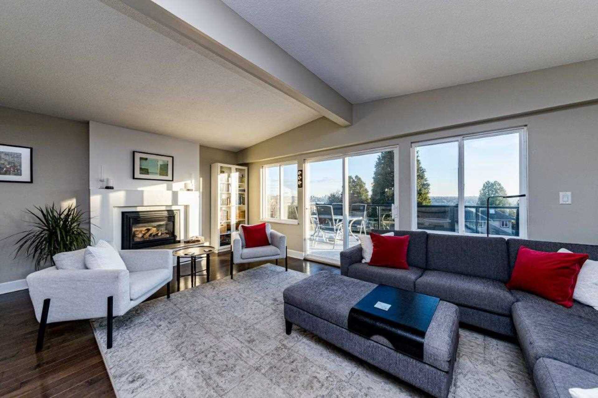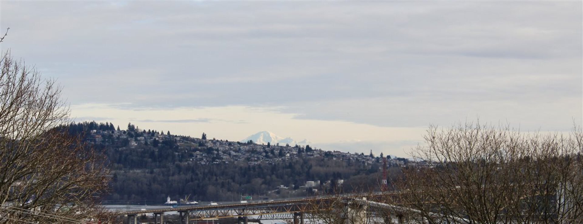 Queensbury family home with views of the City and Mount Baker! You'll be impressed with this post and beam style home on a 50'x137' lot. Main floor entry w/ French door access to a large rec room w/ gas fireplace and tons of natural light. Upstairs is open plan living and dining with vaulted ceiling