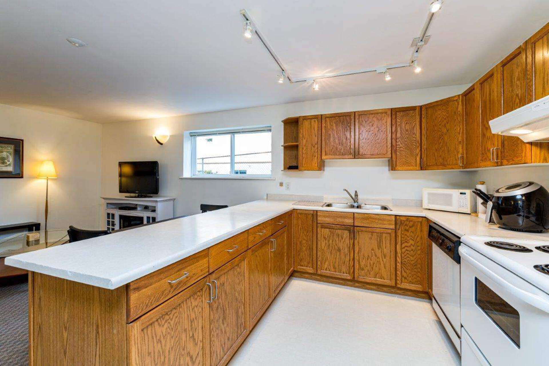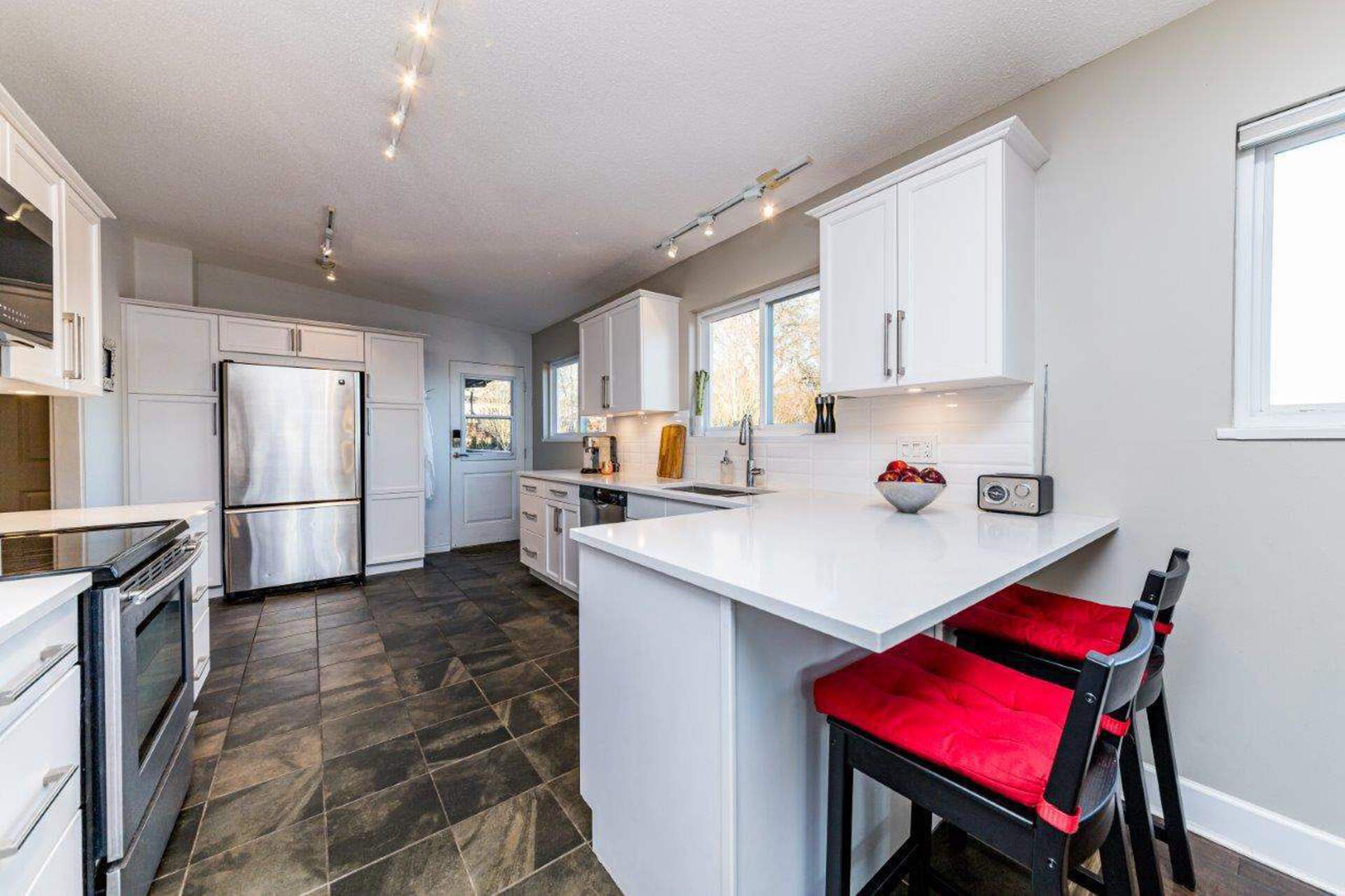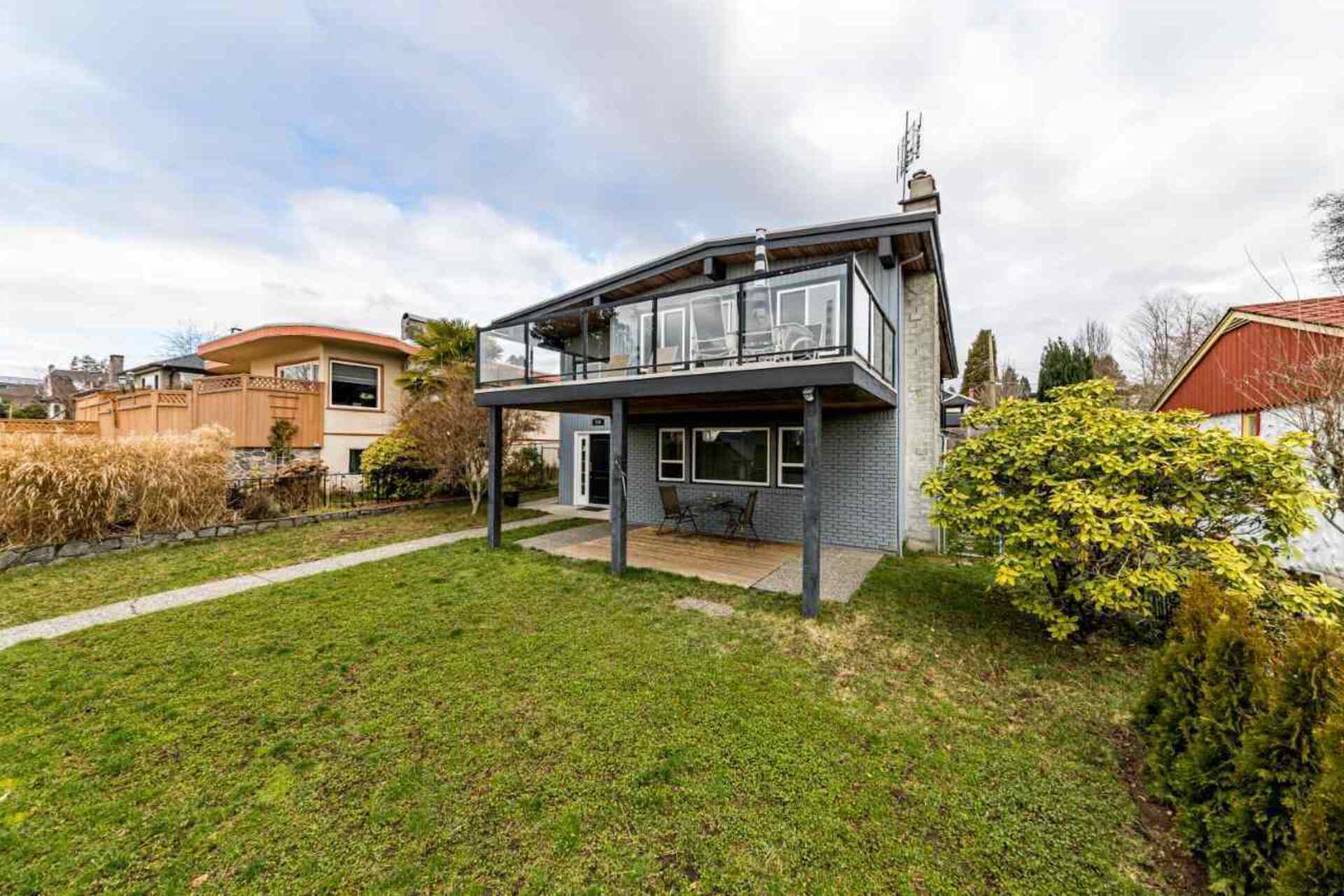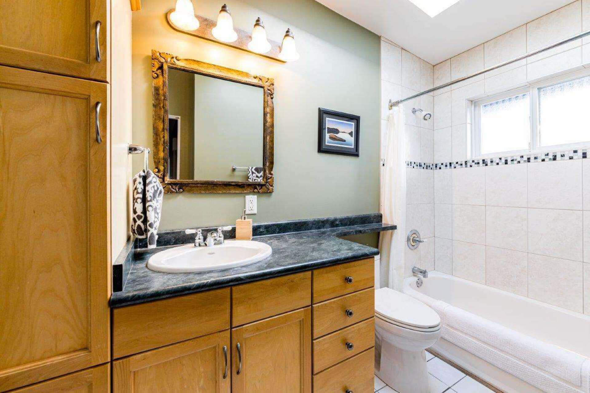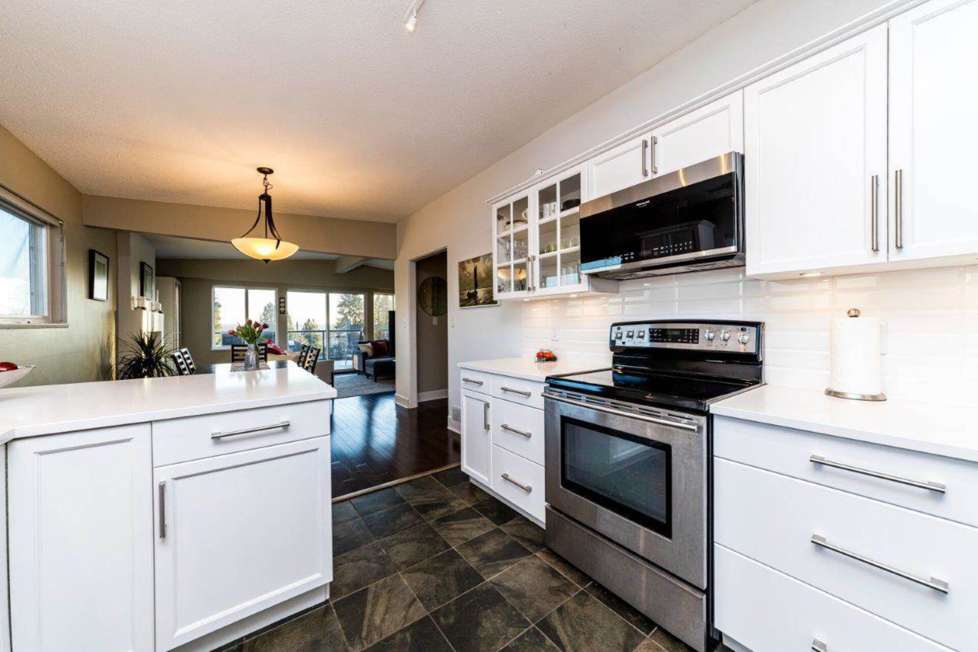 Queensbury family home with views of the City and Mount Baker! You'll be impressed with this post and beam style home on a 50'x137' lot. Main floor entry w/ French door access to a large rec room w/ gas fireplace and tons of natural light. Upstairs is open plan living and dining with vaulted ceiling