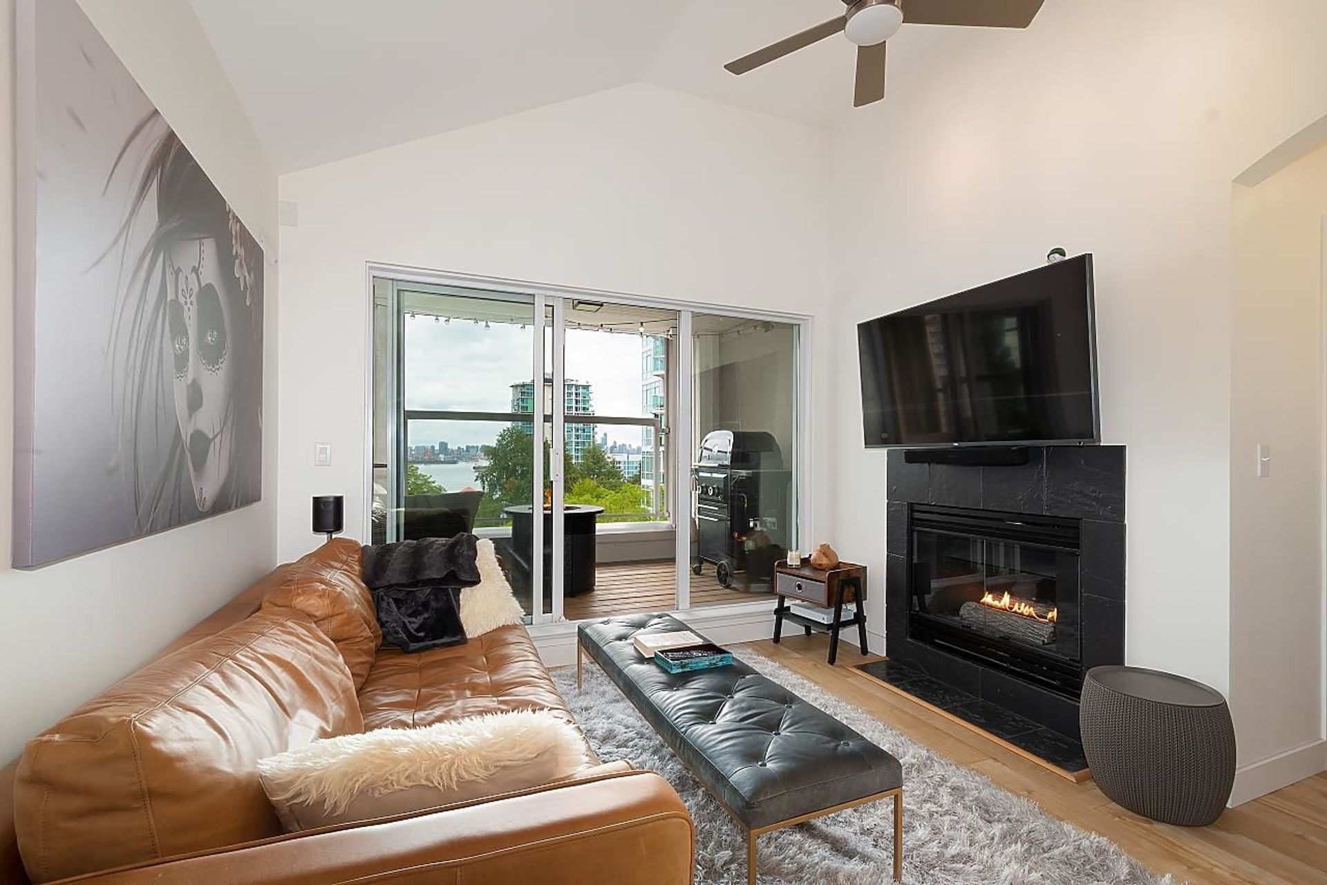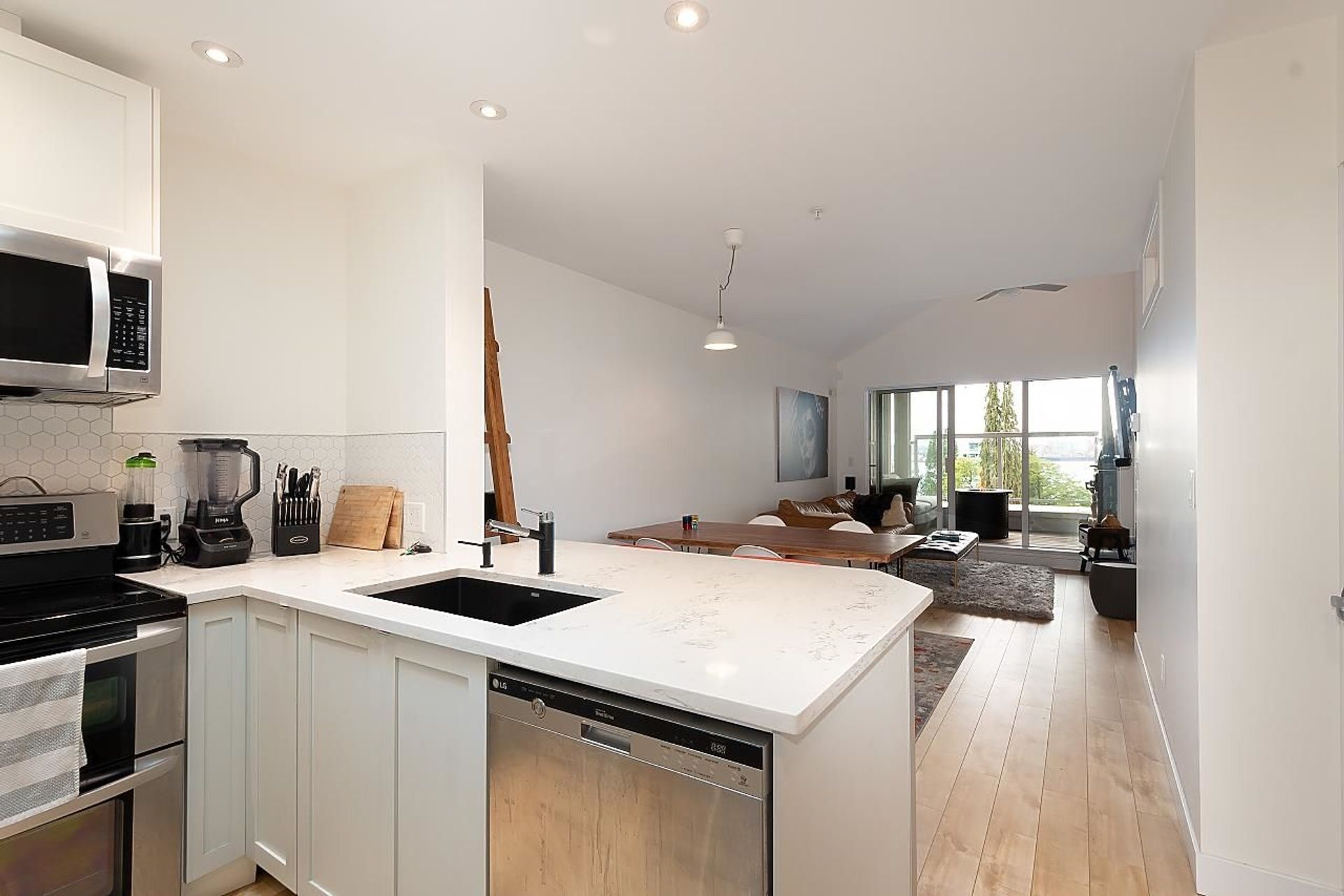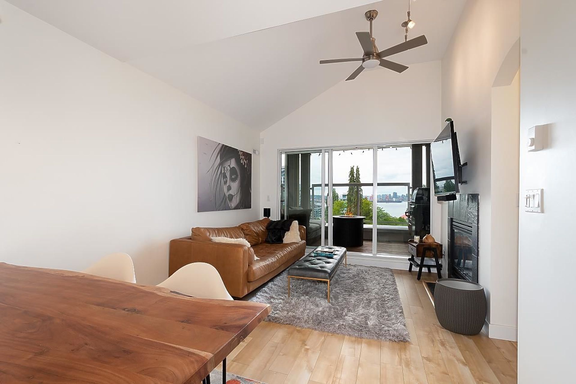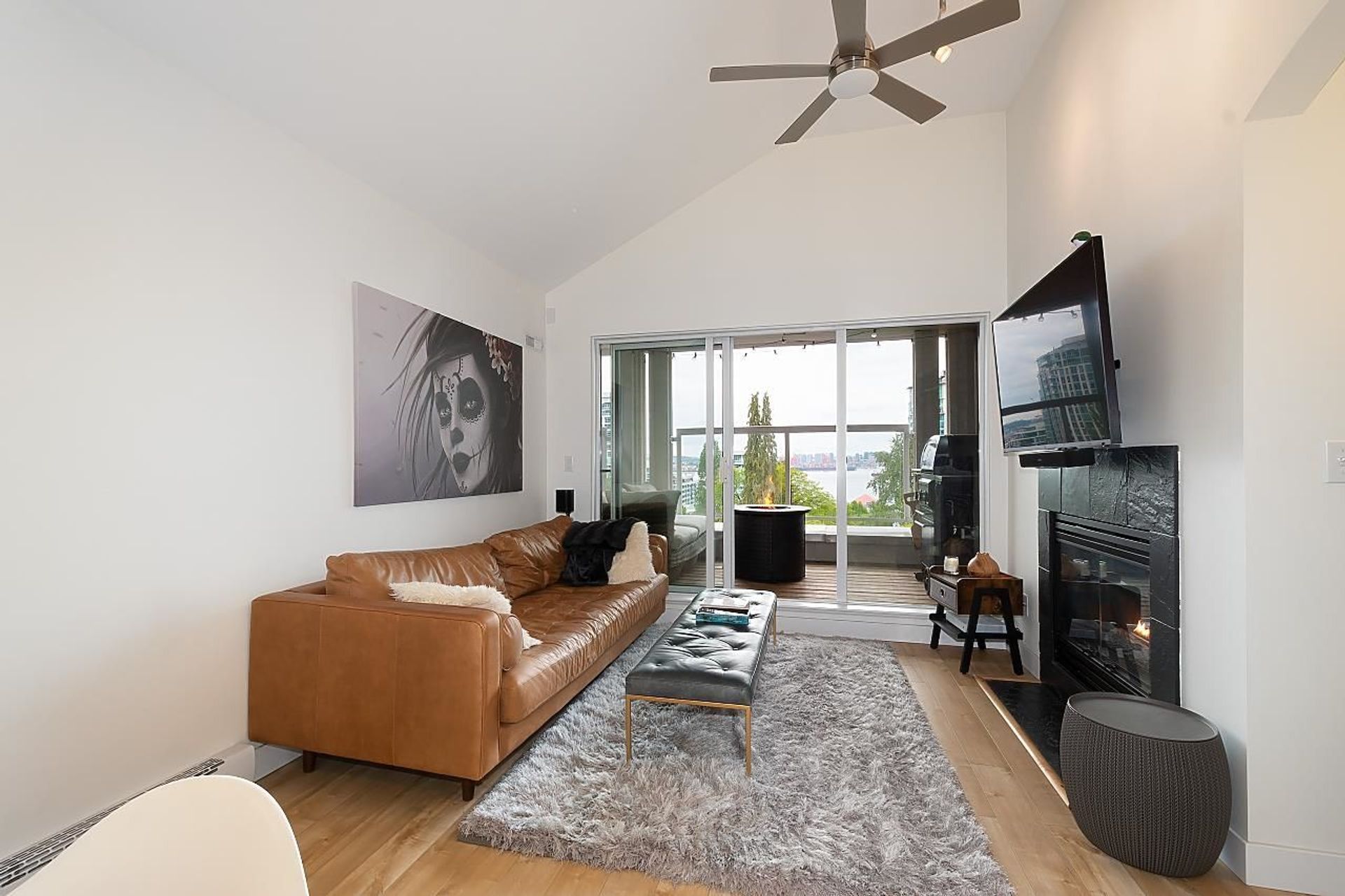 Top floor South facing, view suite on the quiet side of the building! Fully renovated in 2016, you will be impressed with this home the moment you walk through the door!The open concept layout offers a view out towards the harbour and city from all areas. The floor plan is generous with a large kitchen, full sized dining area and comfortable living room with vaulted ceilings and a cozy gas fireplace.There are skylights in the kitchen and bathroom for extra brightness. Enjoy your fully covered patio all year long! The building itself has undergone tons of upgrading including a full enclosure project (rainscreened stucco, windows, balconies, podium membrane, roof) in 2009.In suite laundry, one parking, one storage and two dogs or cats allowed!