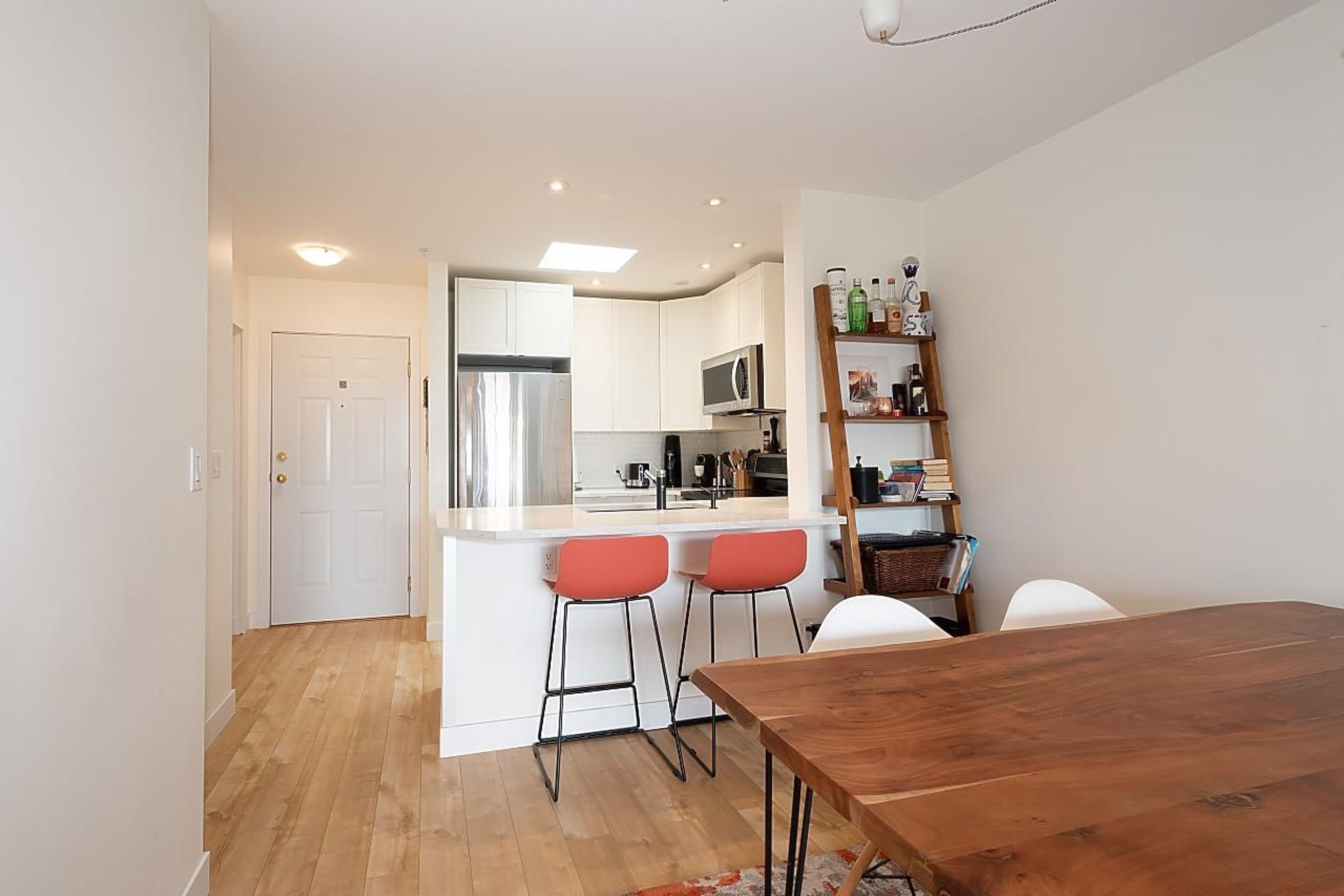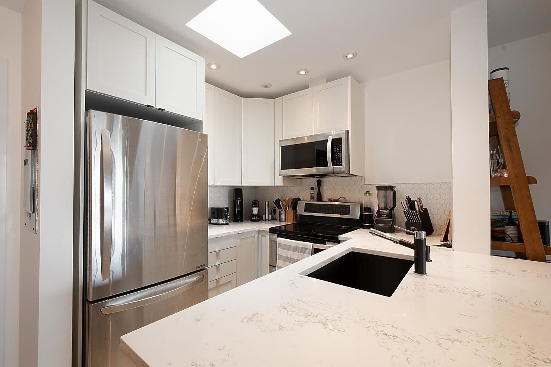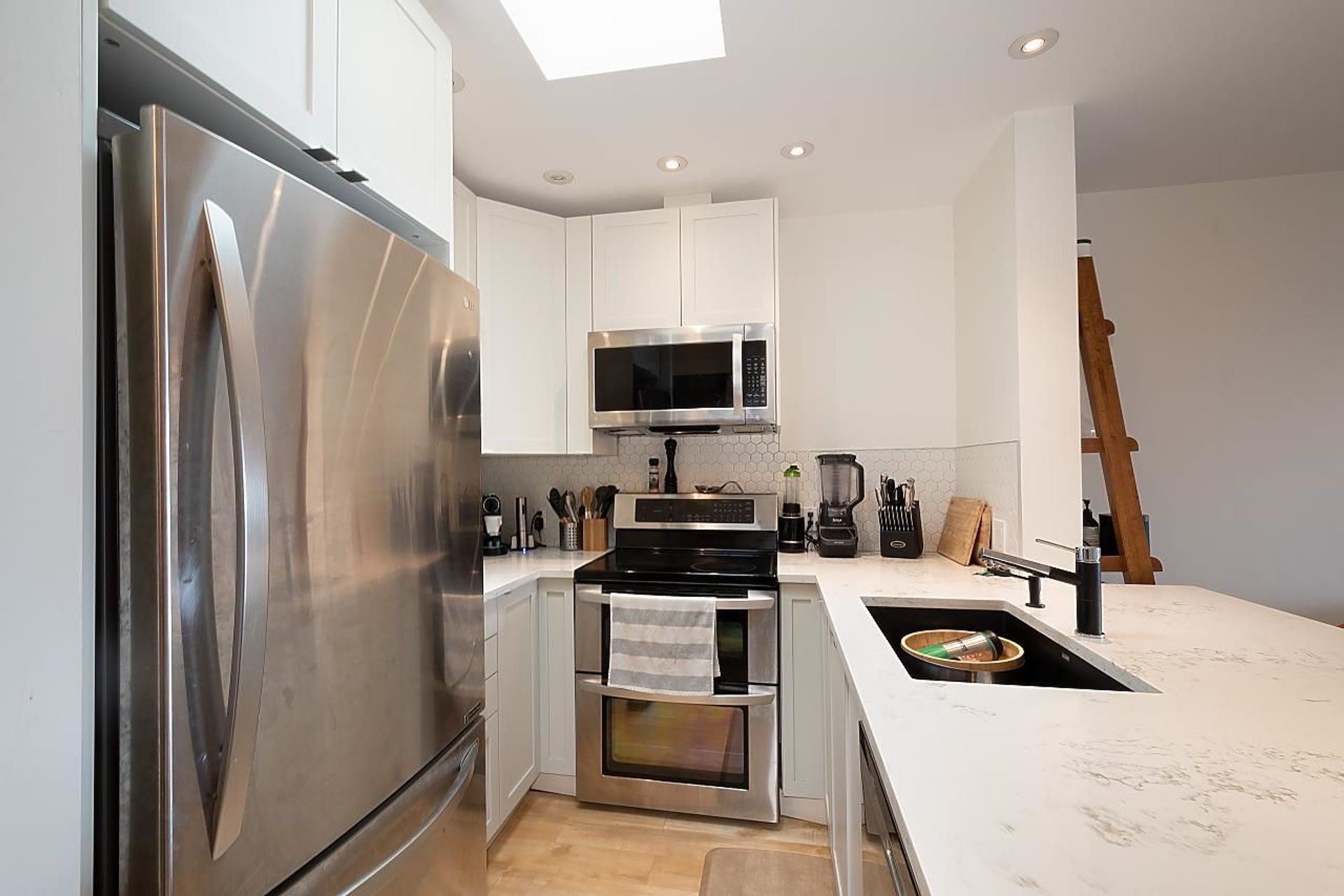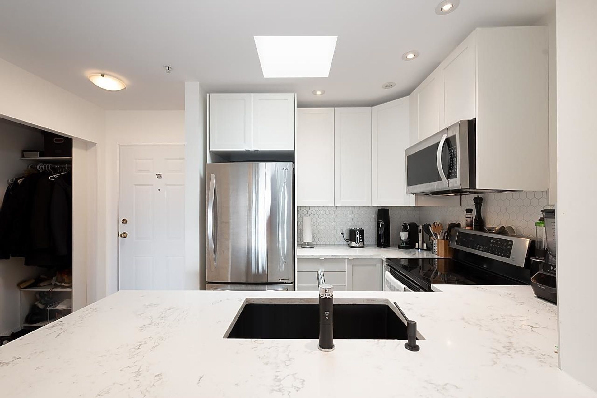 Top floor South facing, view suite on the quiet side of the building! Fully renovated in 2016, you will be impressed with this home the moment you walk through the door!The open concept layout offers a view out towards the harbour and city from all areas. The floor plan is generous with a large kitchen, full sized dining area and comfortable living room with vaulted ceilings and a cozy gas fireplace.There are skylights in the kitchen and bathroom for extra brightness. Enjoy your fully covered patio all year long! The building itself has undergone tons of upgrading including a full enclosure project (rainscreened stucco, windows, balconies, podium membrane, roof) in 2009.In suite laundry, one parking, one storage and two dogs or cats allowed!