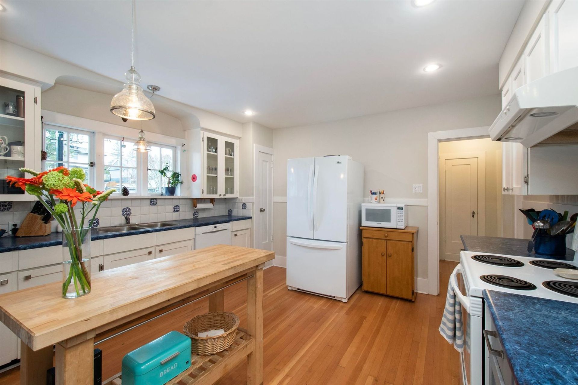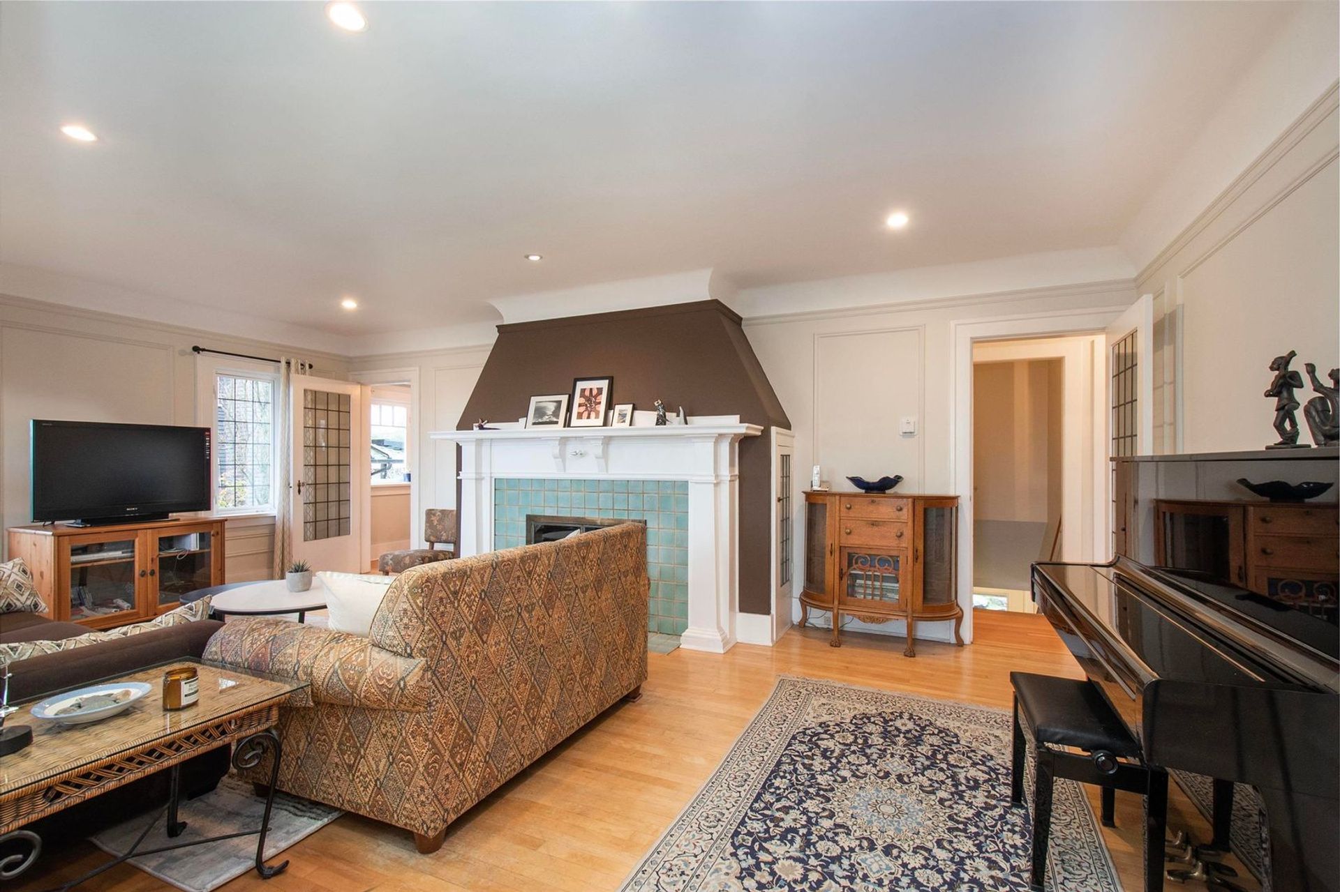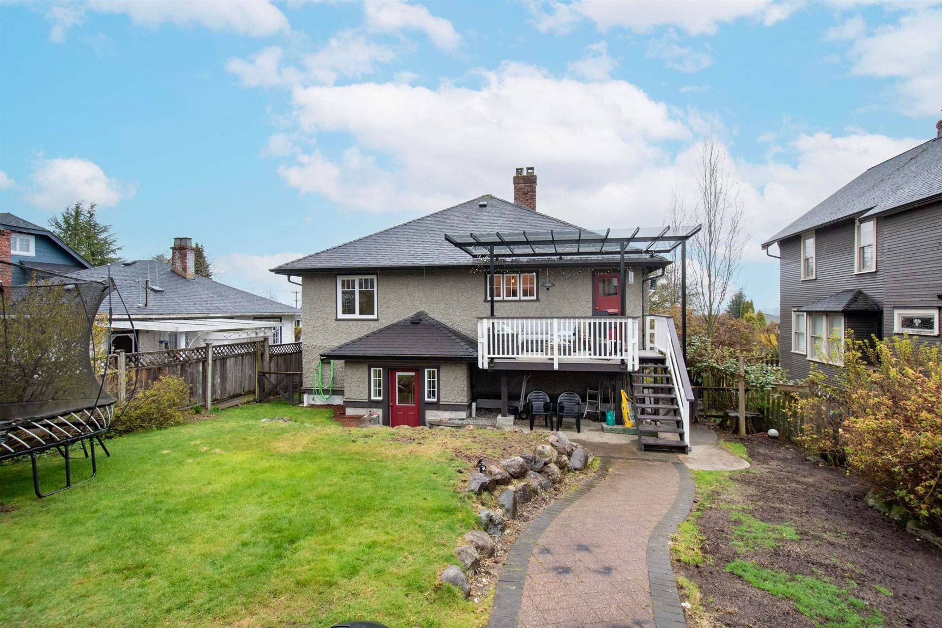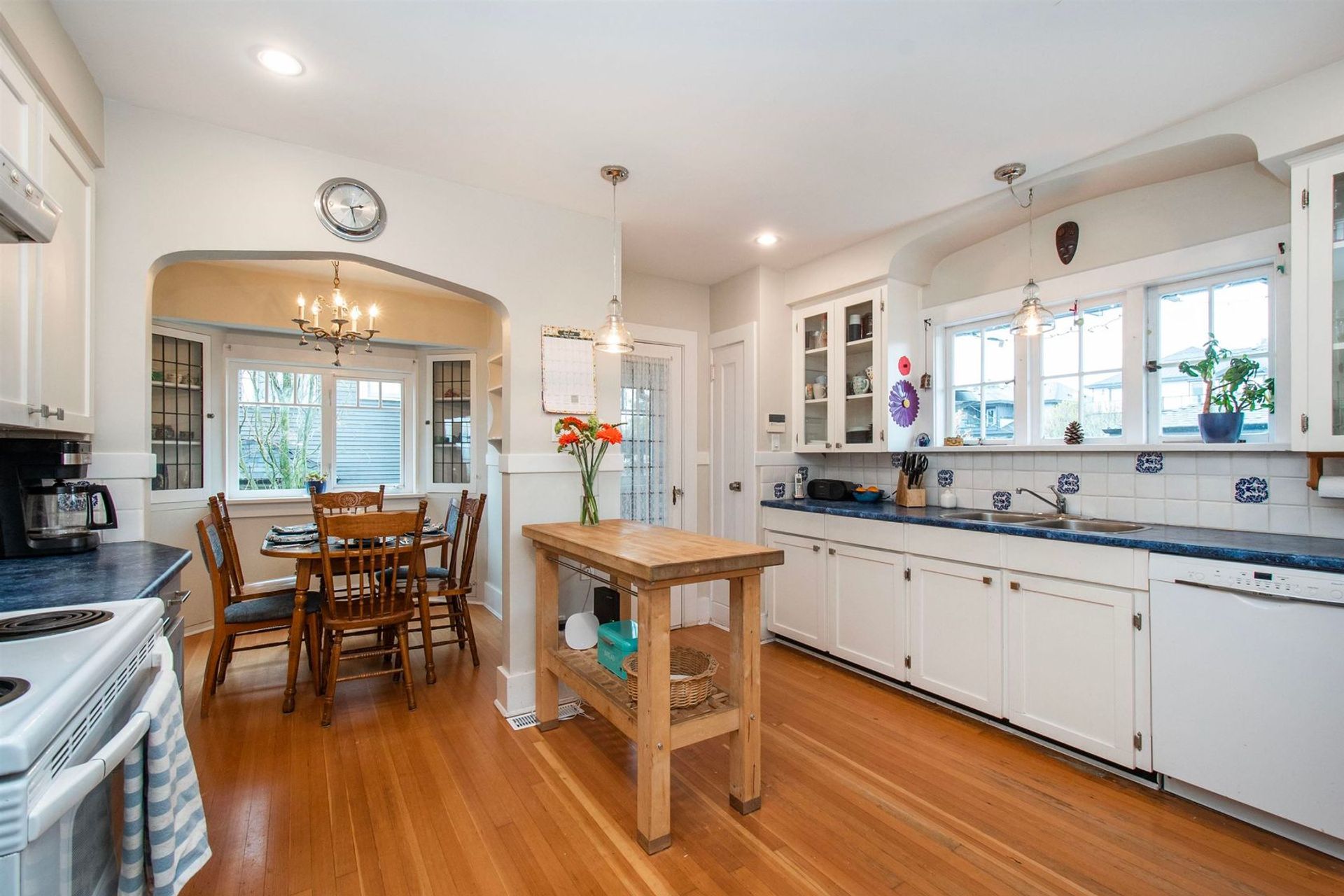 Queensbury Charmer - circa 1929 this gorgeous character home features classic stucco dash exterior, covered front veranda for watching the world go by.Formal entry, huge living room with prominent Art Deco fireplace with leaded glass built-ins, separate dining room also with leaded glass cupboards, large country kitchen with backyard outlook, mudroom with access to covered entertaining deck, two bedrooms, fir floors throughout and updated four piece bath with Nu-heat.The house was professionally raised and renovated with permits in 2011 creating a full height bright and airy basement featuring two generous bedrooms, huge rec room, big laundry/mudroom, three piece bath, storage area and outside access secure bike/sports storage.Extra large garage with 200 amp service. Great location on a quiet street.