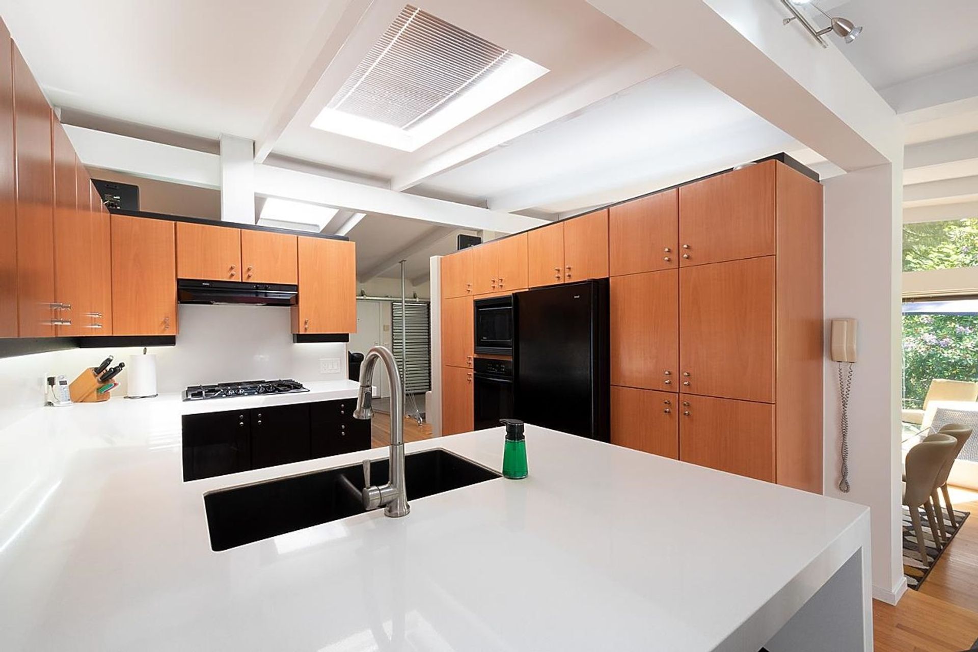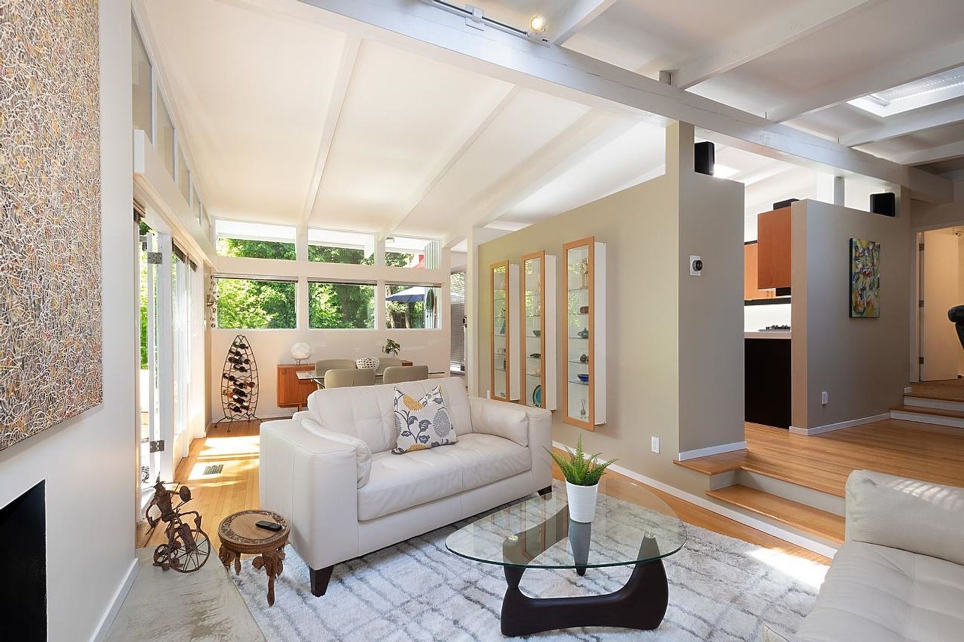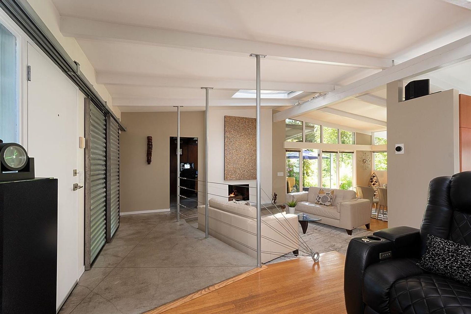 Mid Century serenity - you will get a sense of calm as you enter into this beautifully renovated post and beam rancher. Located on a private and sunny stream side lot.Features include polished concrete entry, open plan living, dining and media room with original oak floors, dramatic vaulted ceiling