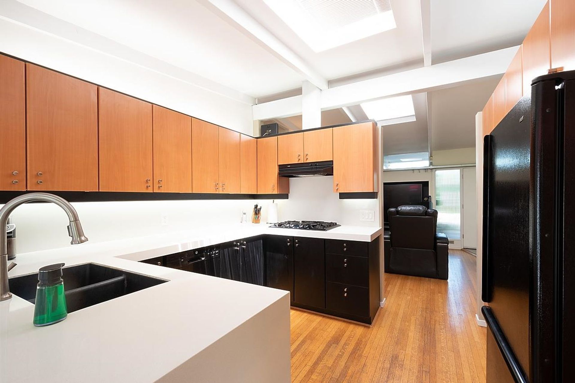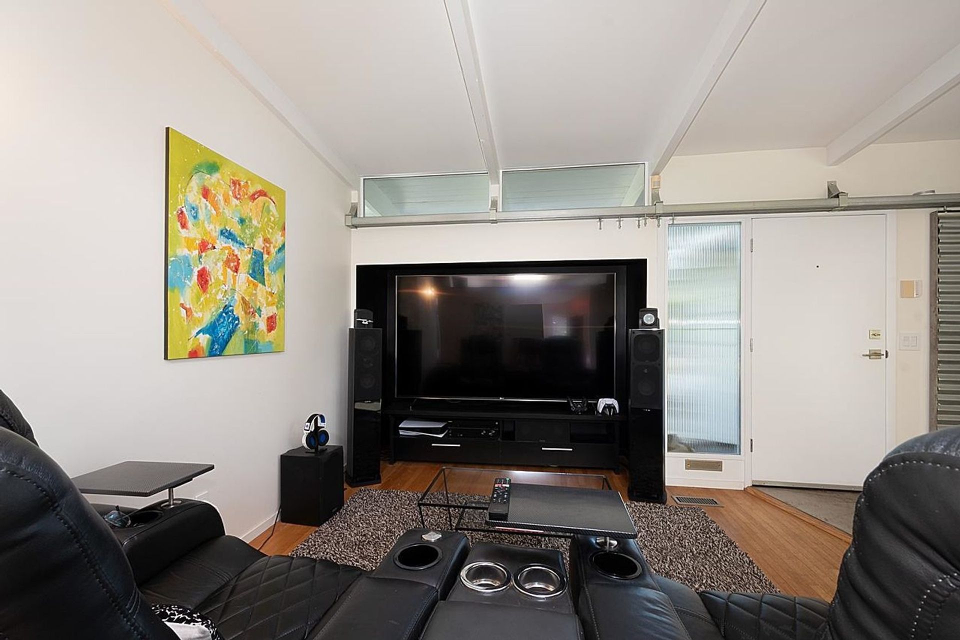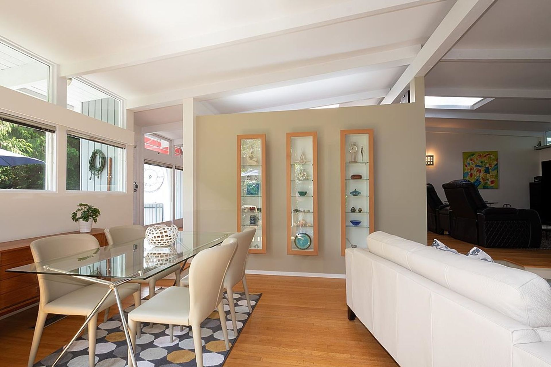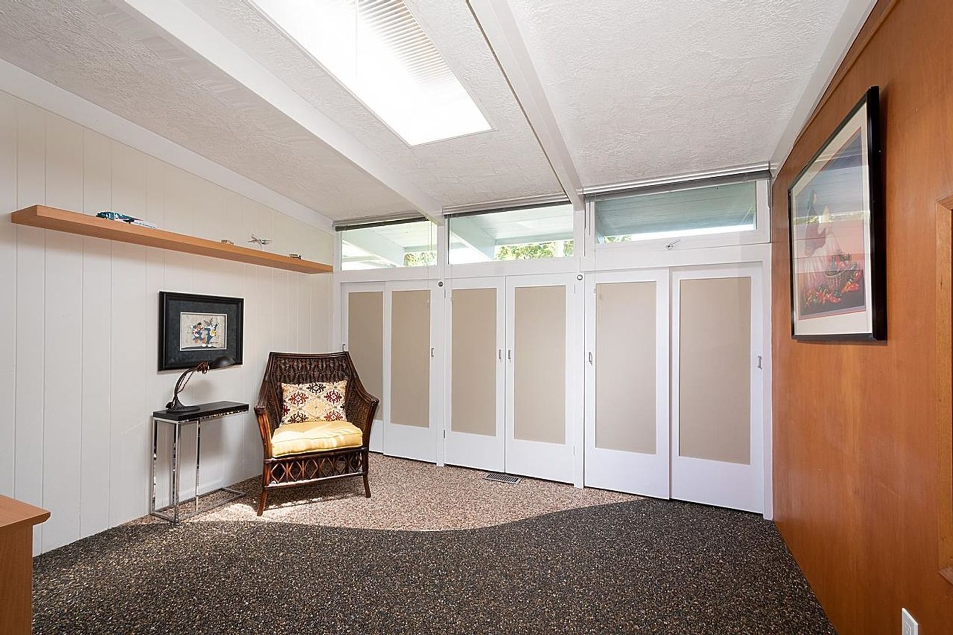 Mid Century serenity - you will get a sense of calm as you enter into this beautifully renovated post and beam rancher. Located on a private and sunny stream side lot.Features include polished concrete entry, open plan living, dining and media room with original oak floors, dramatic vaulted ceiling