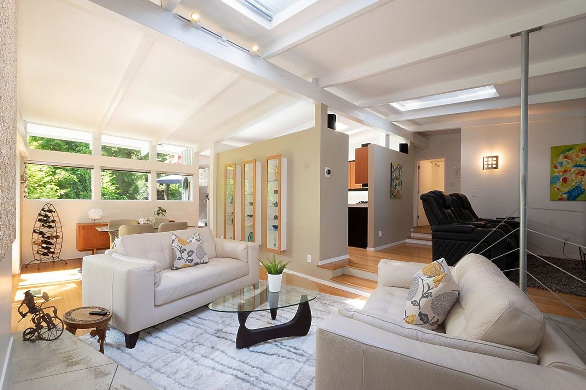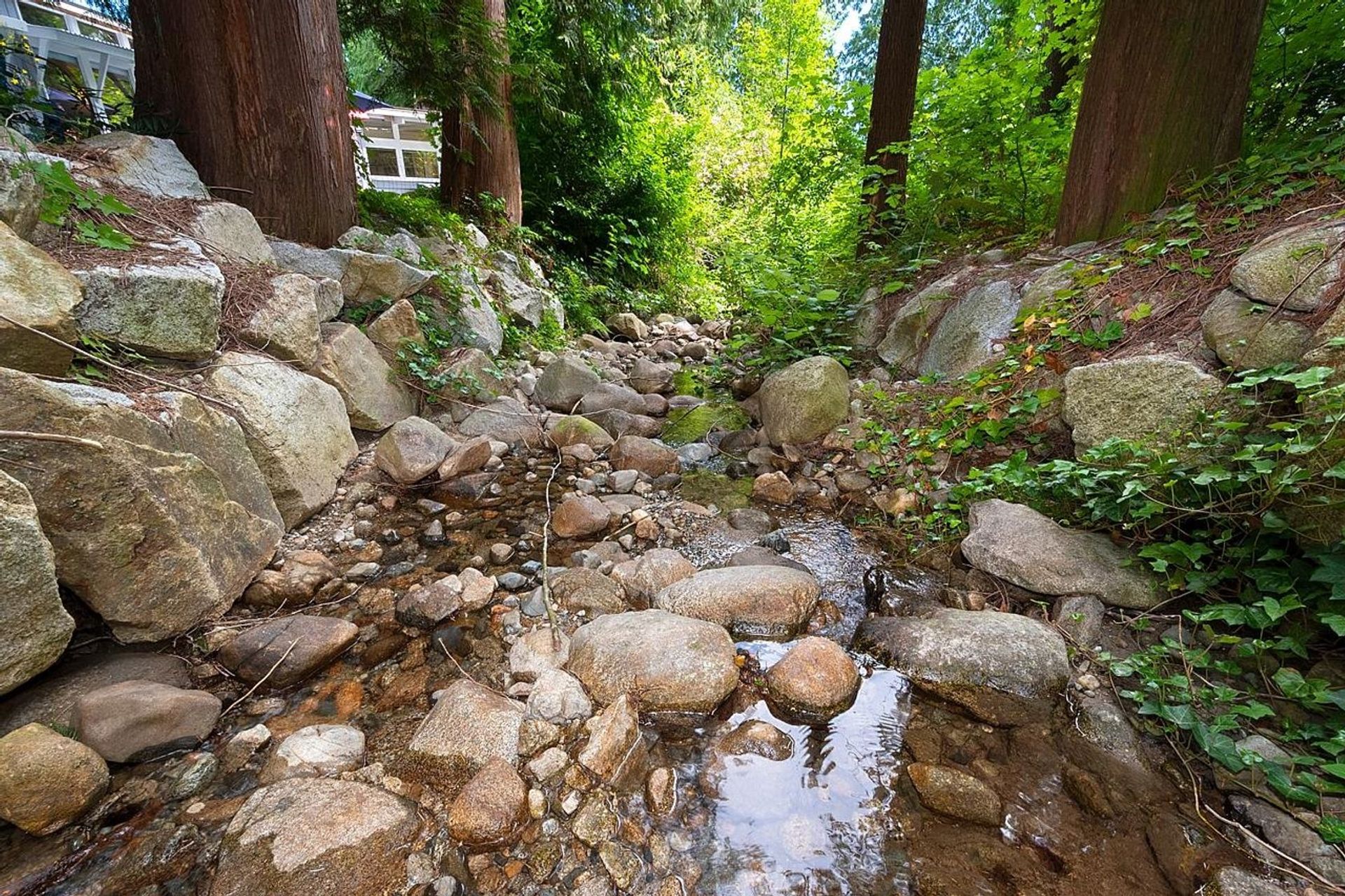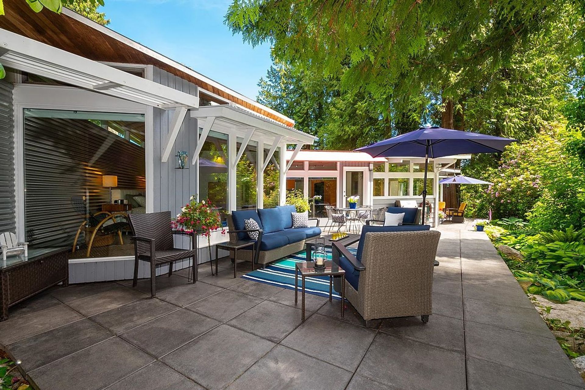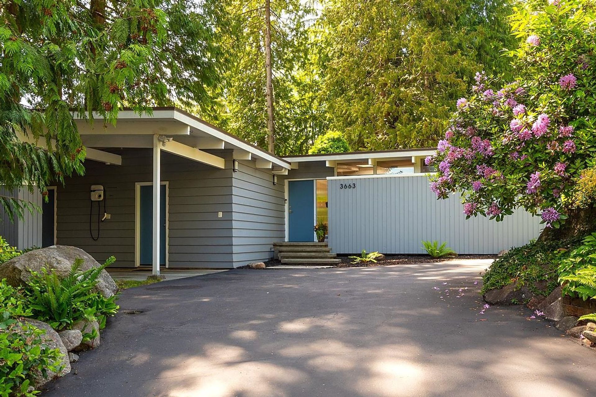 Mid Century serenity - you will get a sense of calm as you enter into this beautifully renovated post and beam rancher. Located on a private and sunny stream side lot.Features include polished concrete entry, open plan living, dining and media room with original oak floors, dramatic vaulted ceiling and floor to ceiling windows, large bright kitchen with quartz counters and eating area, traditional office with original wood paneling and double sided fireplace.Oversized primary bedroom four piece ensuite, walk in closet and striking corrugated steel feature wall, two additional bedrooms and a second full bathroom.Outdoors is an entertainers dream with a 790 sqft patio, covered area with N/G space heater and gorgeous forested and creek side outlook. A dramatic home in a central location. Hurry!