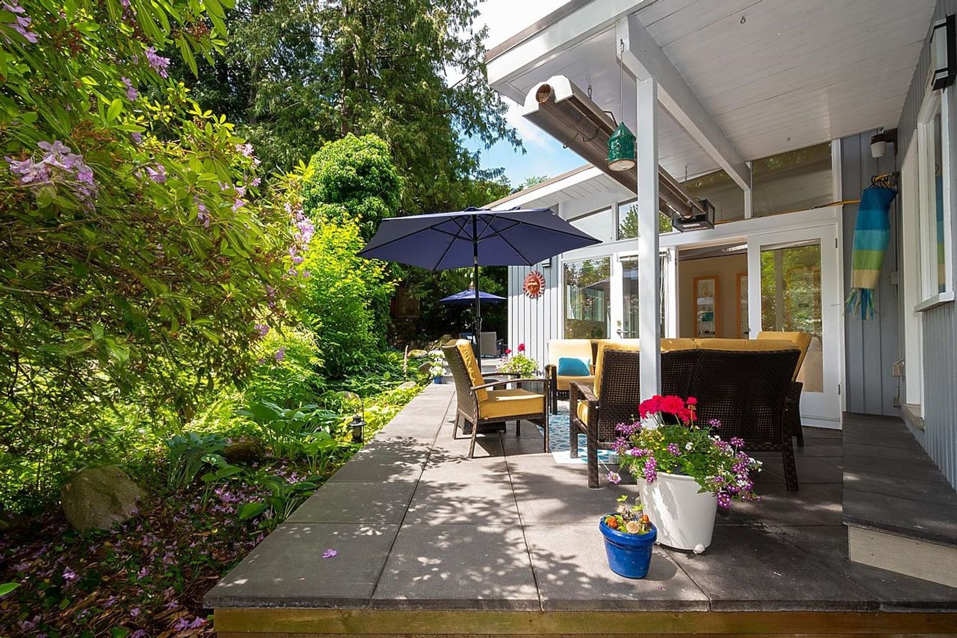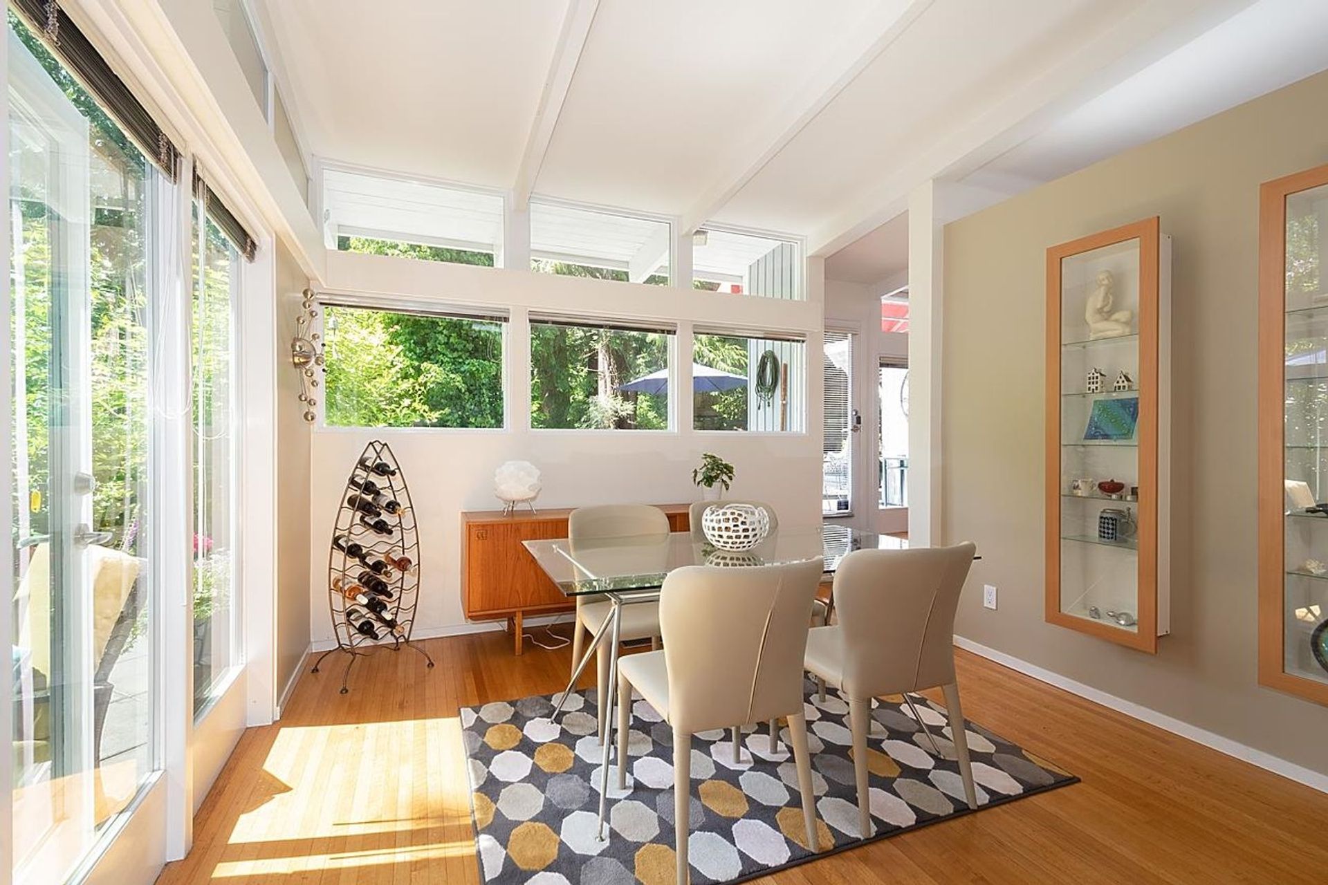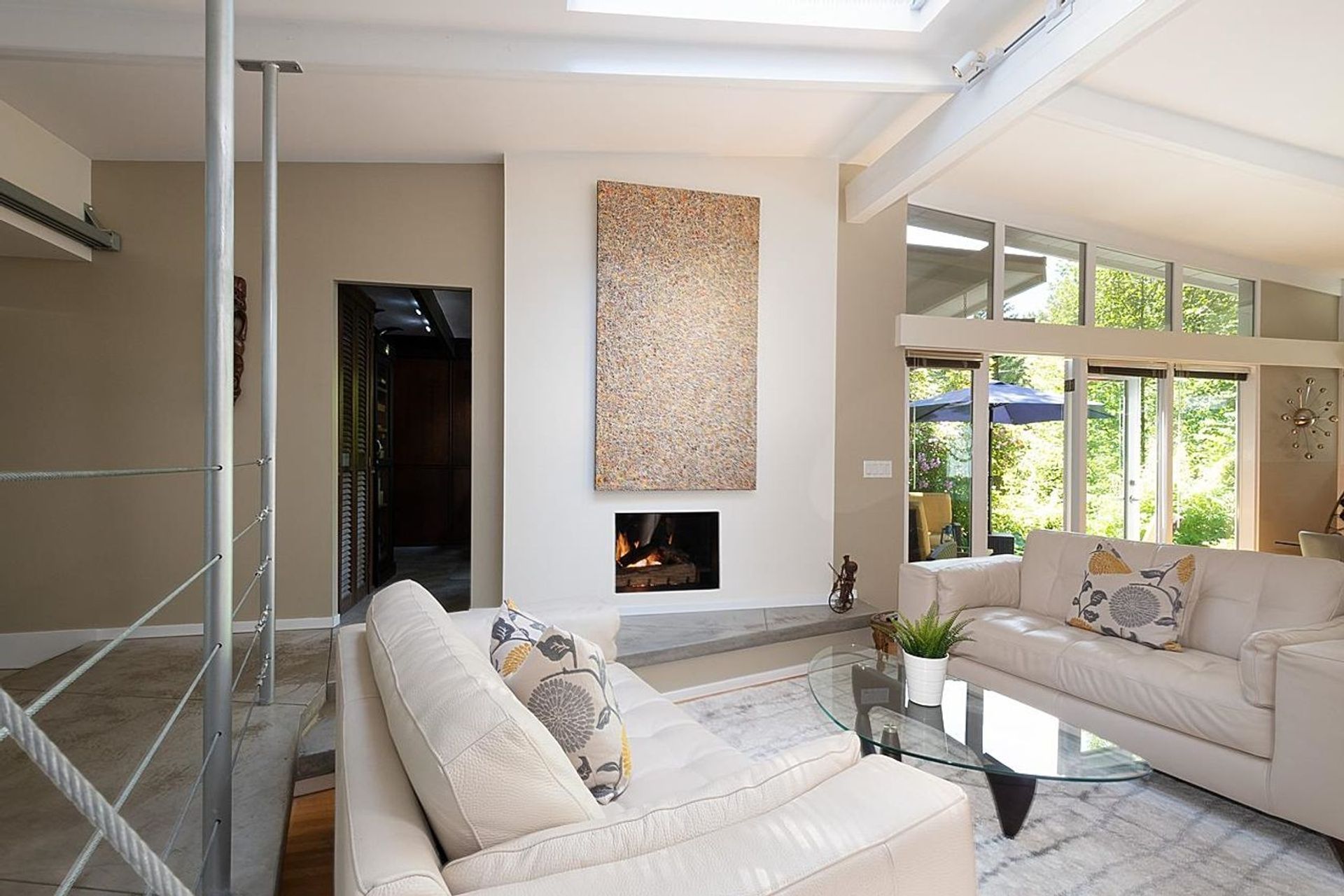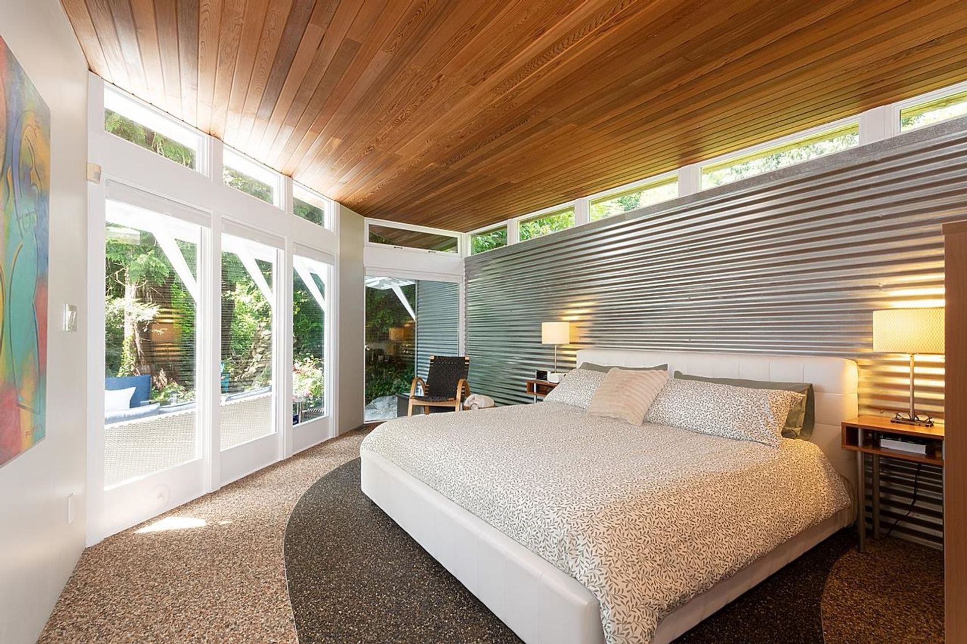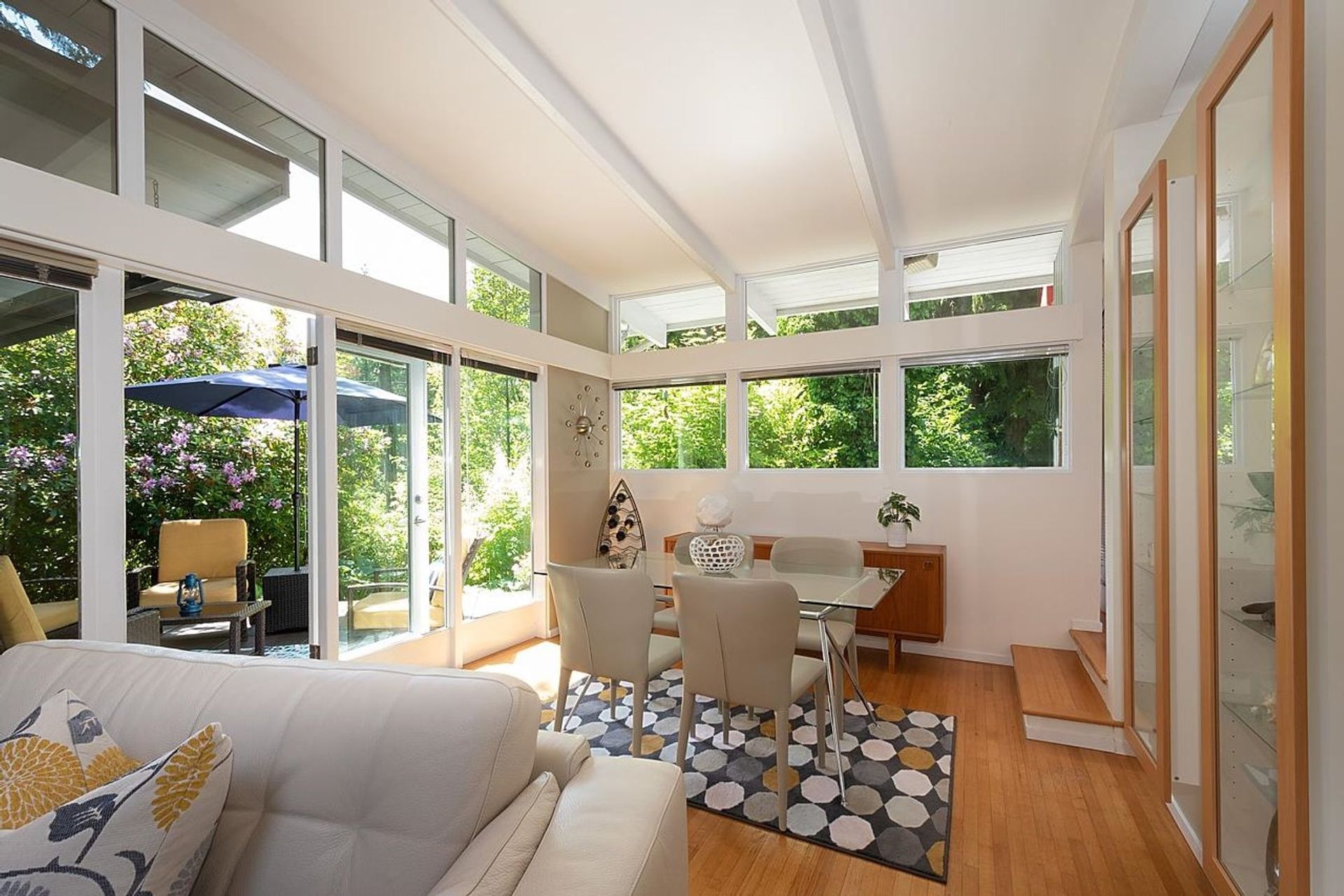 Mid Century serenity - you will get a sense of calm as you enter into this beautifully renovated post and beam rancher. Located on a private and sunny stream side lot.Features include polished concrete entry, open plan living, dining and media room with original oak floors, dramatic vaulted ceiling and floor to ceiling windows, large bright kitchen with quartz counters and eating area, traditional office with original wood paneling and double sided fireplace.Oversized primary bedroom four piece ensuite, walk in closet and striking corrugated steel feature wall, two additional bedrooms and a second full bathroom.Outdoors is an entertainers dream with a 790 sqft patio, covered area with N/G space heater and gorgeous forested and creek side outlook. A dramatic home in a central location. Hurry!