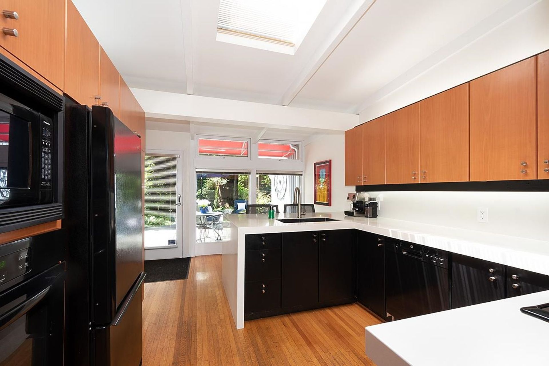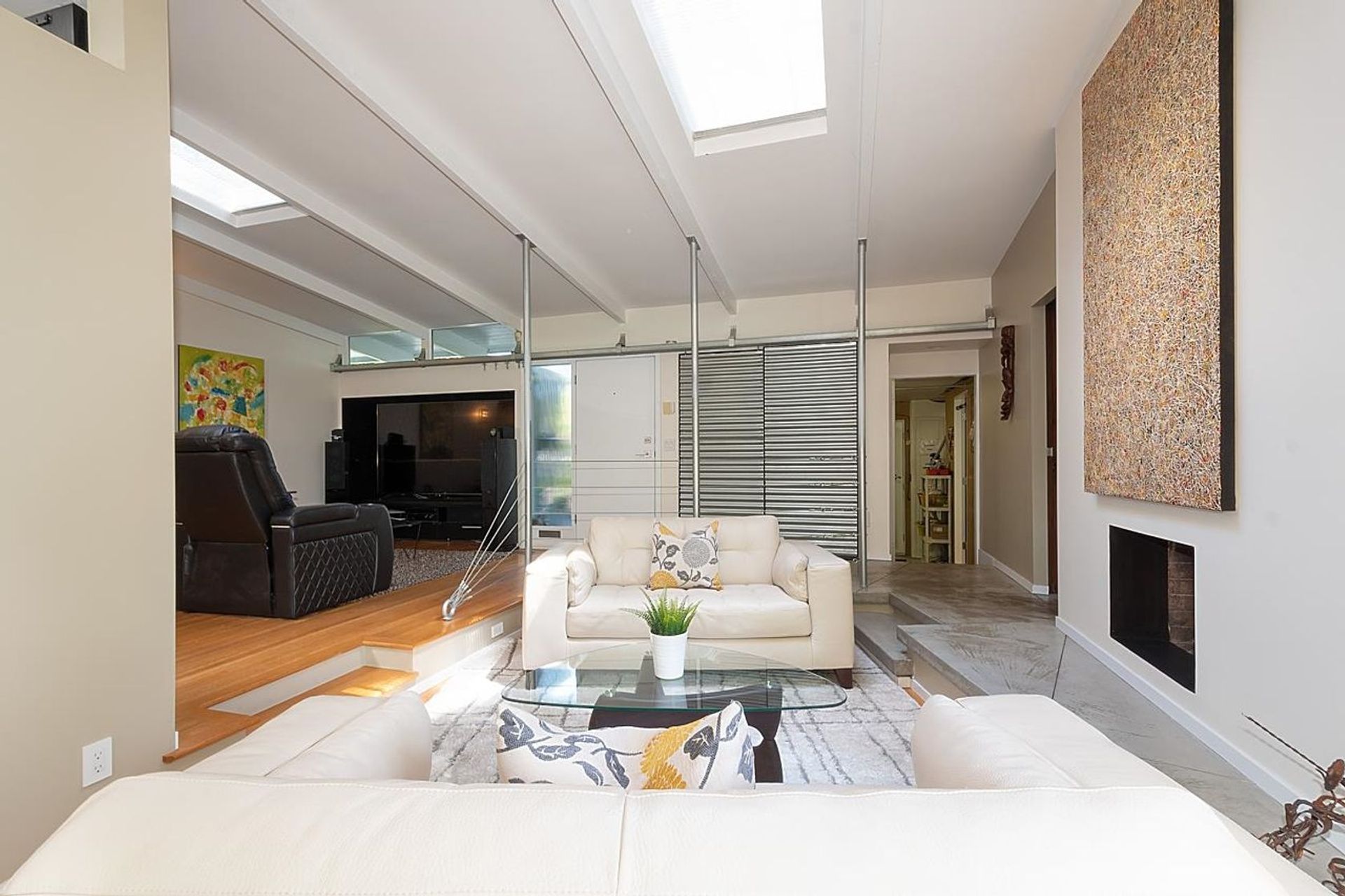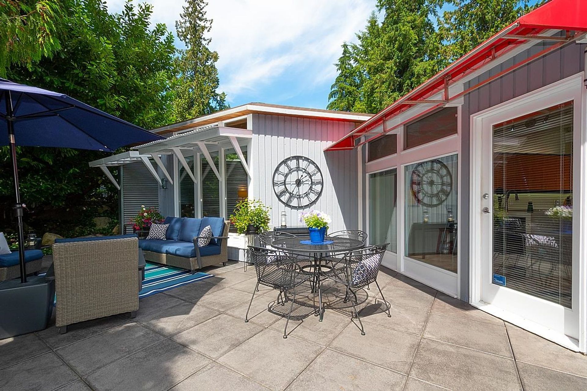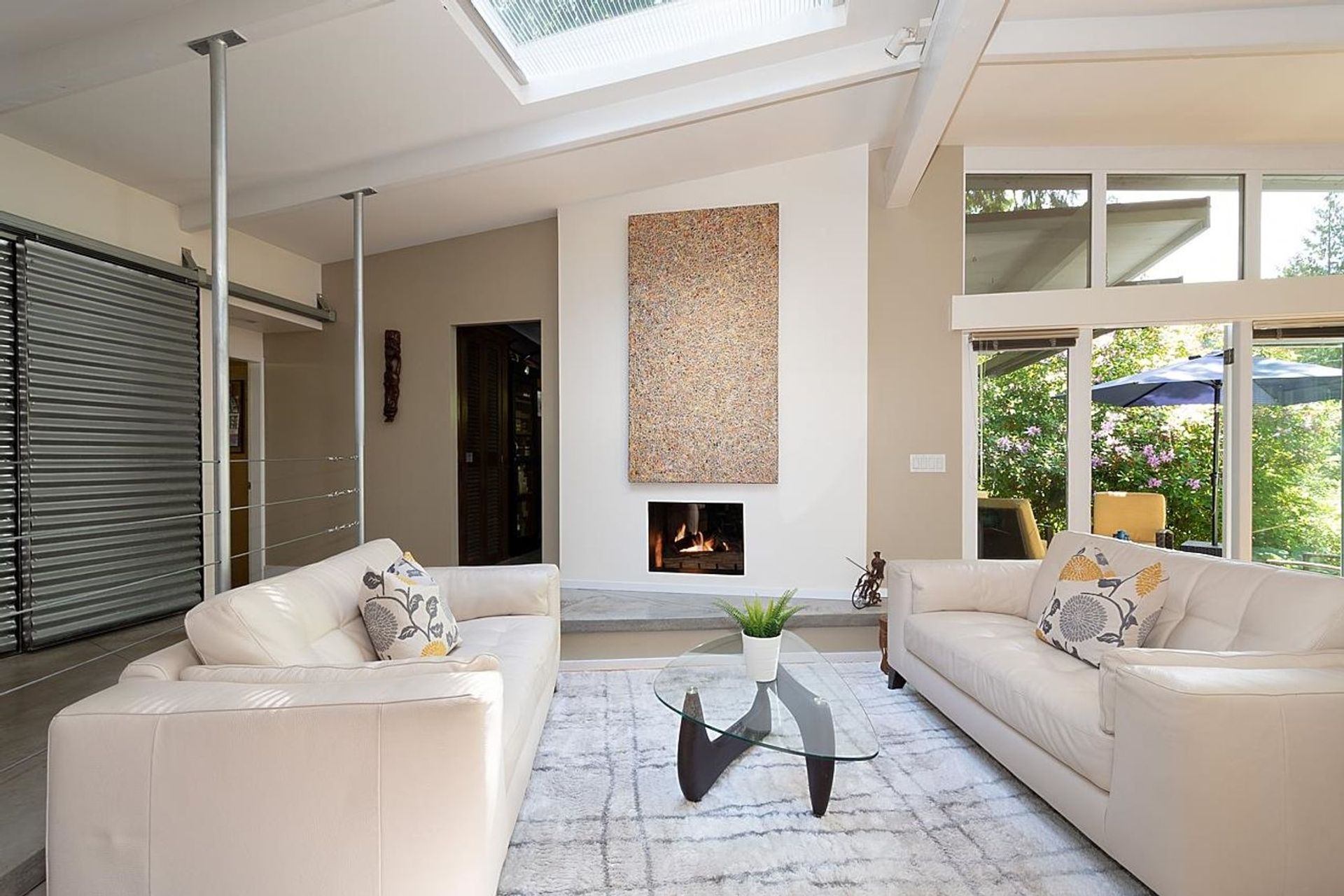 Mid Century serenity - you will get a sense of calm as you enter into this beautifully renovated post and beam rancher. Located on a private and sunny stream side lot.Features include polished concrete entry, open plan living, dining and media room with original oak floors, dramatic vaulted ceiling and floor to ceiling windows, large bright kitchen with quartz counters and eating area, traditional office with original wood paneling and double sided fireplace.Oversized primary bedroom four piece ensuite, walk in closet and striking corrugated steel feature wall, two additional bedrooms and a second full bathroom.Outdoors is an entertainers dream with a 790 sqft patio, covered area with N/G space heater and gorgeous forested and creek side outlook. A dramatic home in a central location. Hurry!