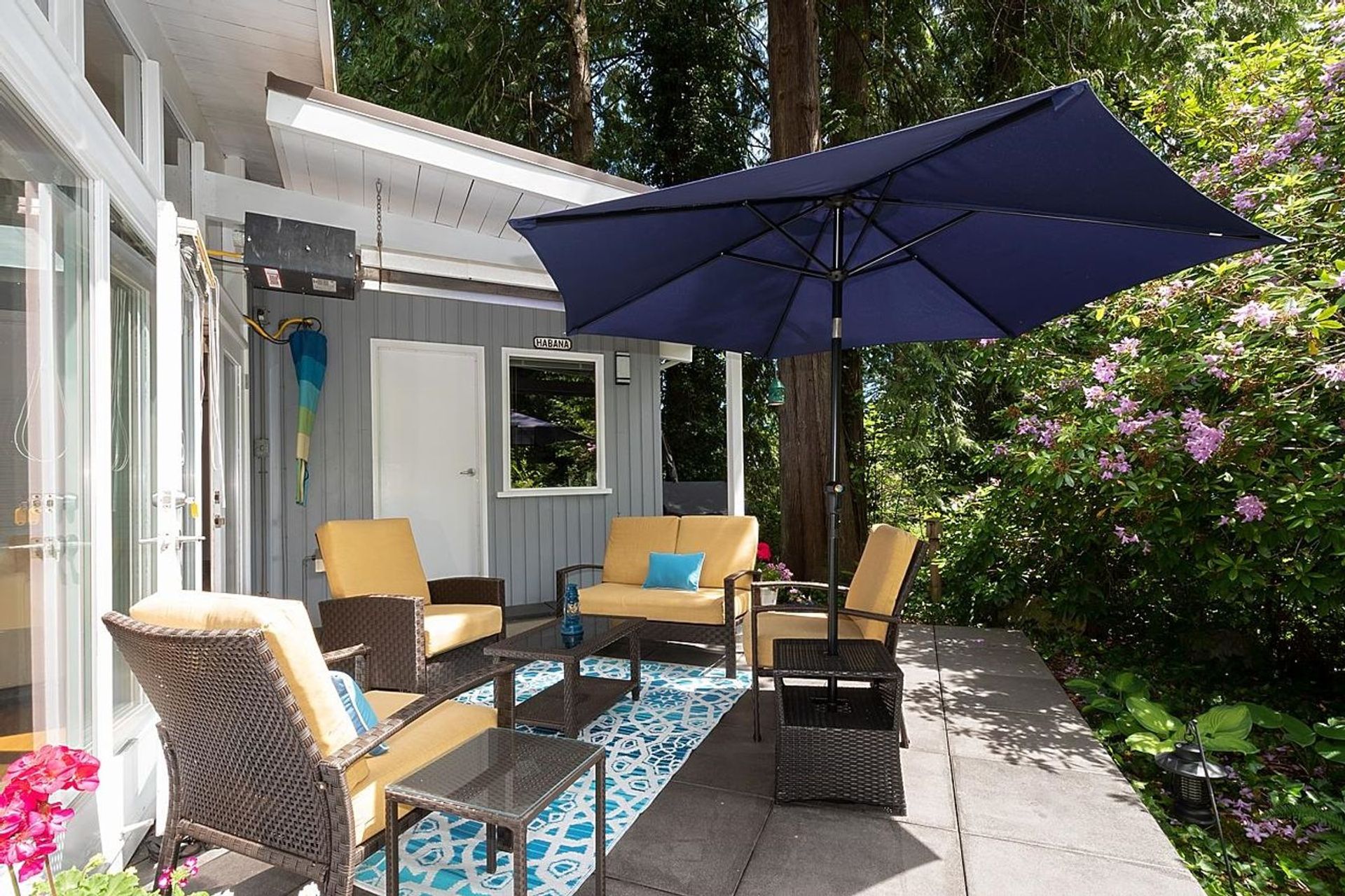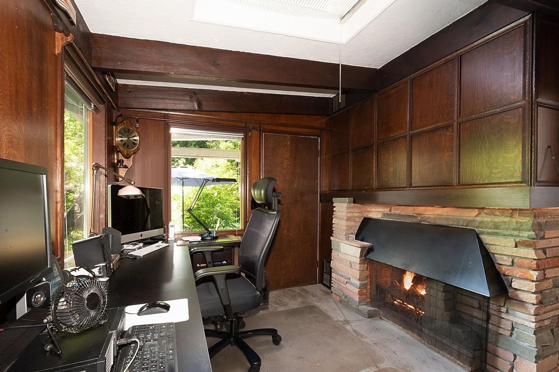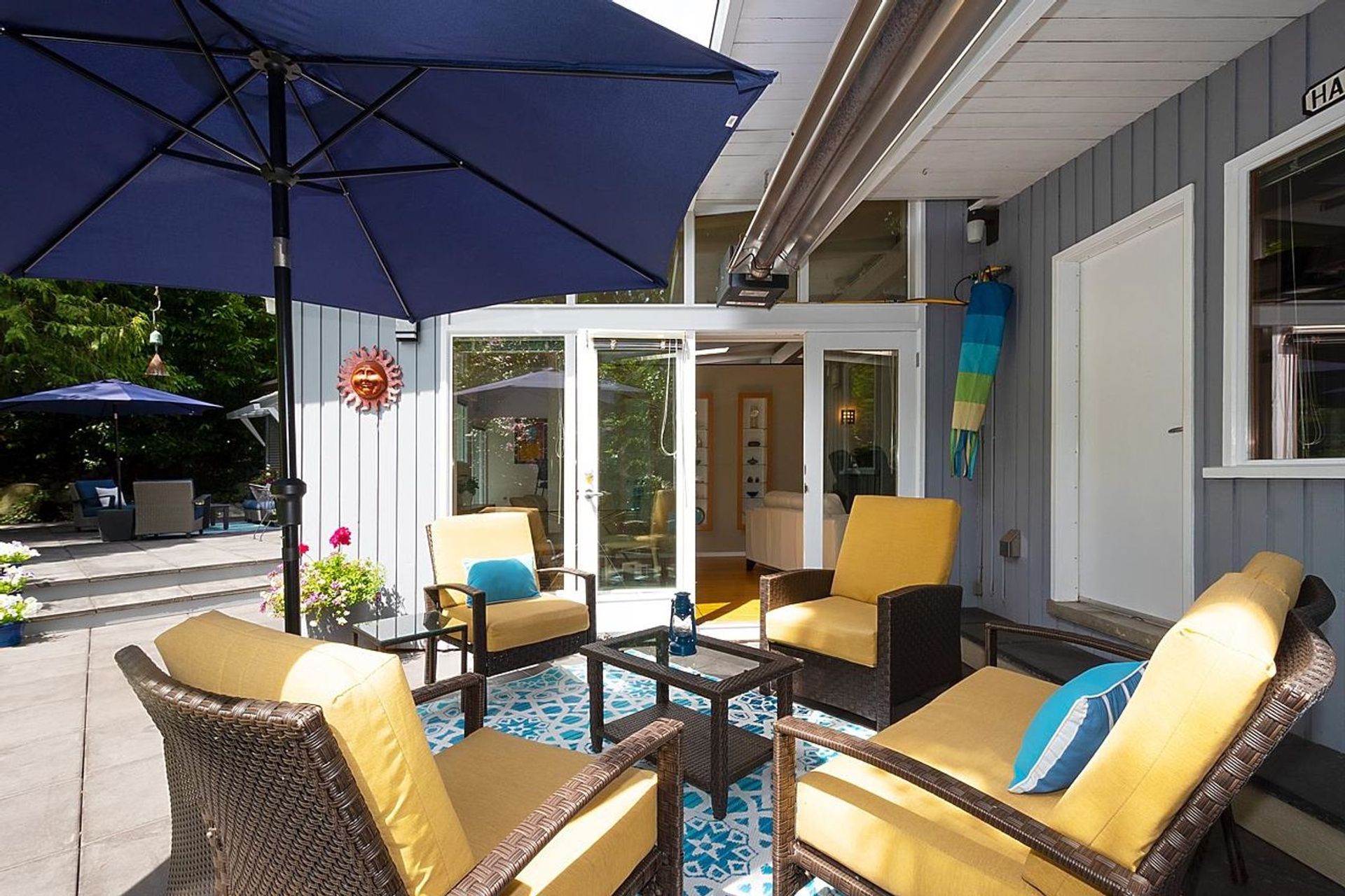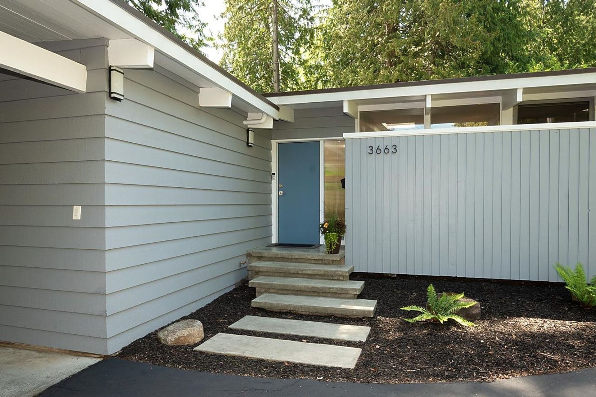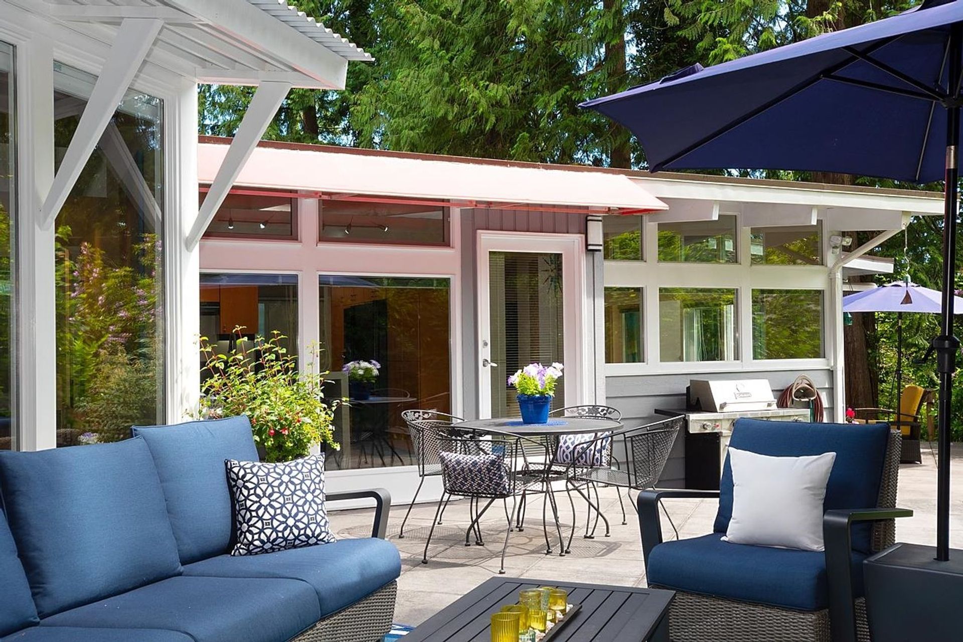 Mid Century serenity - you will get a sense of calm as you enter into this beautifully renovated post and beam rancher. Located on a private and sunny stream side lot.Features include polished concrete entry, open plan living, dining and media room with original oak floors, dramatic vaulted ceiling and floor to ceiling windows, large bright kitchen with quartz counters and eating area, traditional office with original wood paneling and double sided fireplace.Oversized primary bedroom four piece ensuite, walk in closet and striking corrugated steel feature wall, two additional bedrooms and a second full bathroom.Outdoors is an entertainers dream with a 790 sqft patio, covered area with N/G space heater and gorgeous forested and creek side outlook. A dramatic home in a central location. Hurry!
