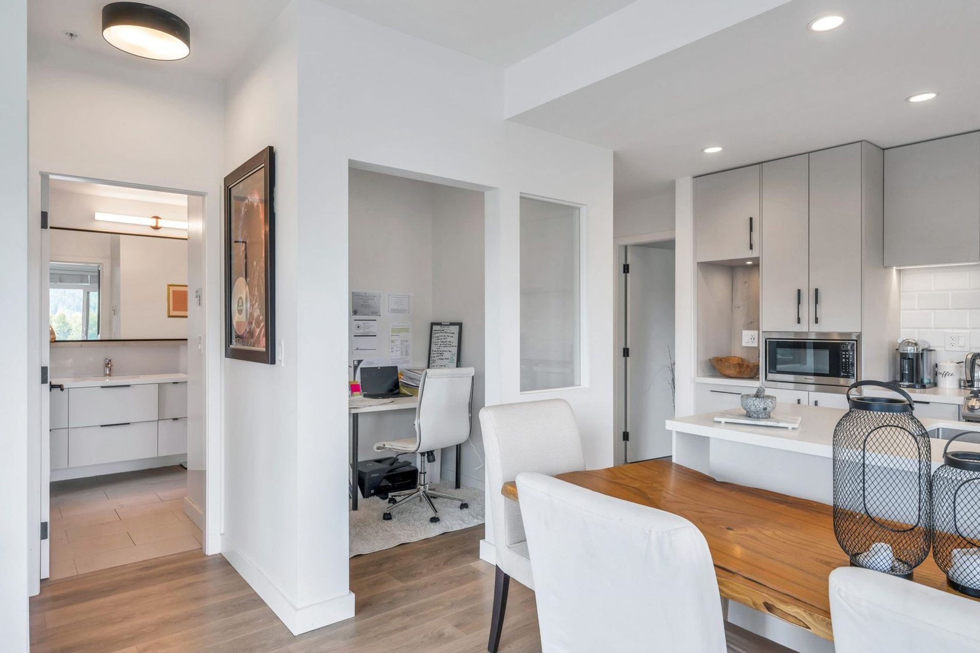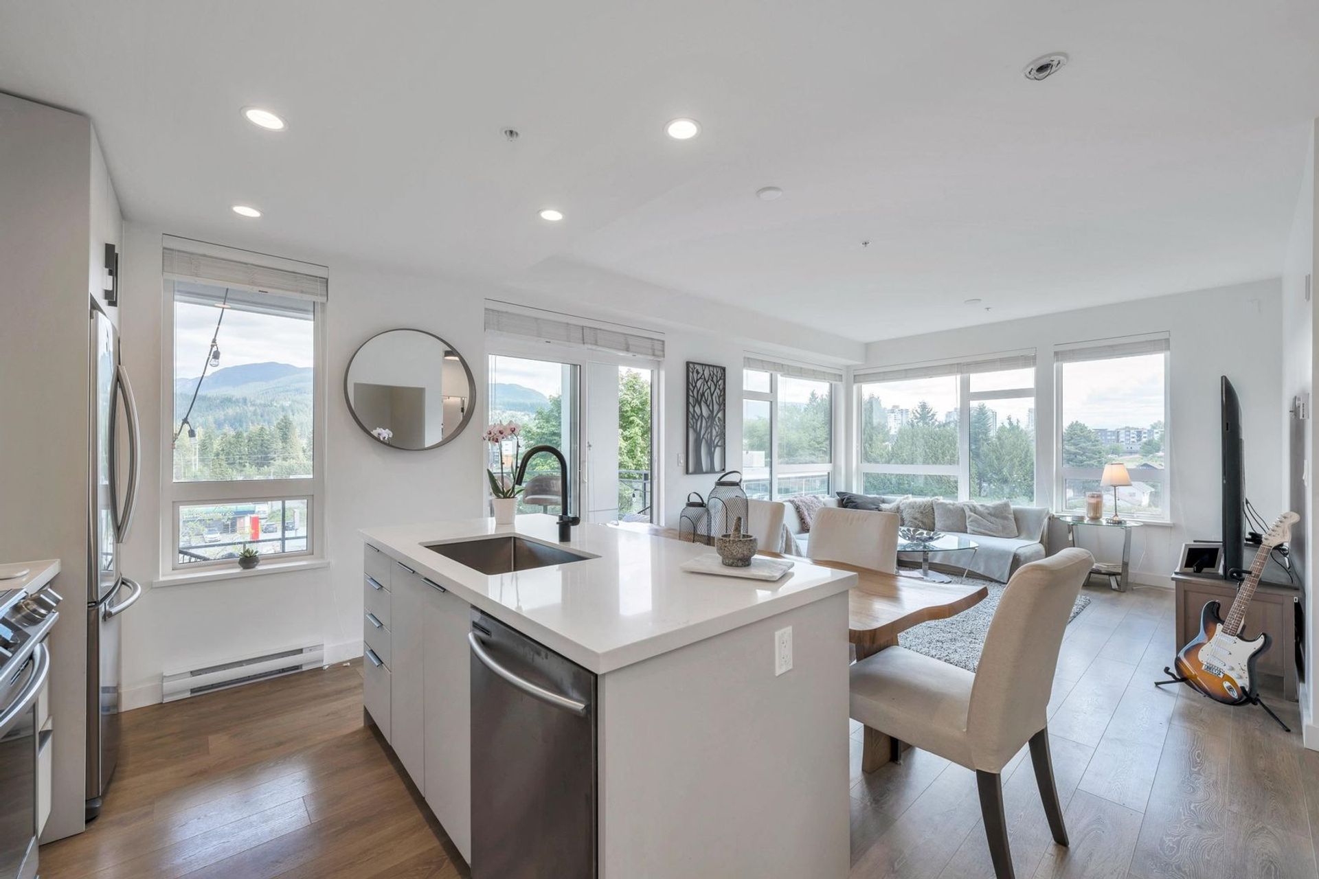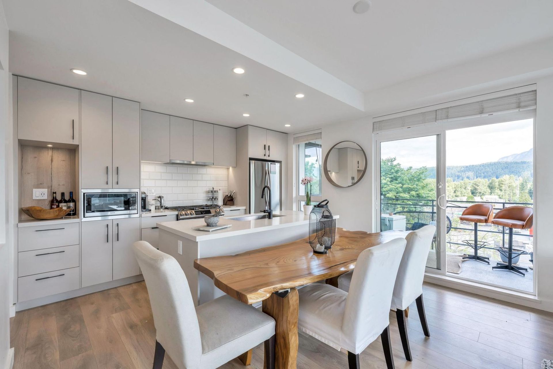 This beautiful 2 bedroom, 2 bath, 1021 SQFT corner unit is located in one of Port Moody's most desirable neighbourhoods! A bright, spaciously designed floorplan provides separated bedrooms & ensuites, walk-in closet, flex room & lots of storage. Enjoy breathtaking North facing mountain views from a fantastic private balcony. A chef's dream kitchen features quartz countertops, soft-close cabinets, a large island, & premium European full-sized appliances. Building amenities include meeting room, dog washing room, workshop, club house with outdoor fire pit & BBQ. 5 minute walk to Moody Centre Skytrain Station, West Coast Express, Barnet Hwy, breweries, parks, trails, restaurants & shops.