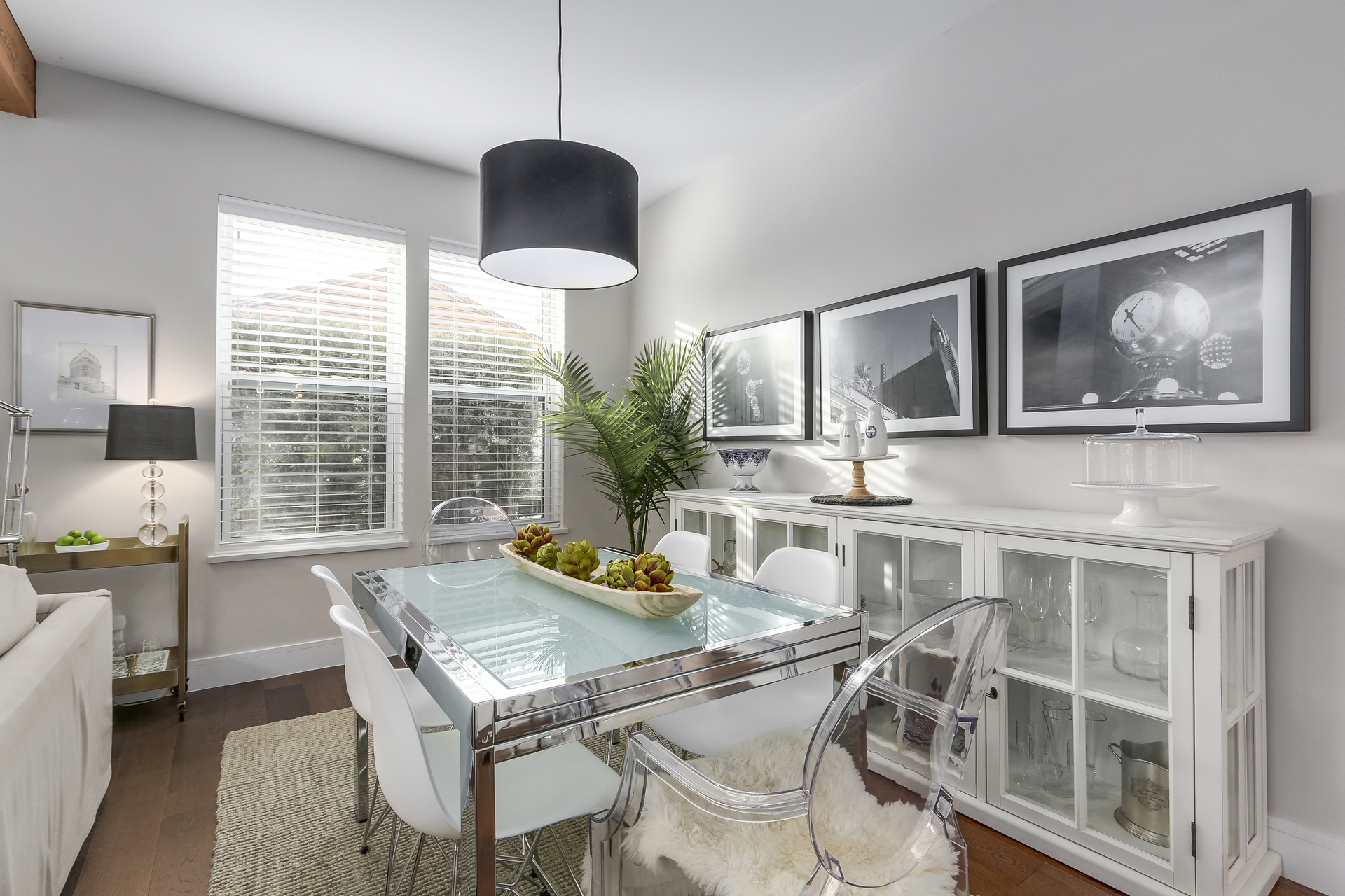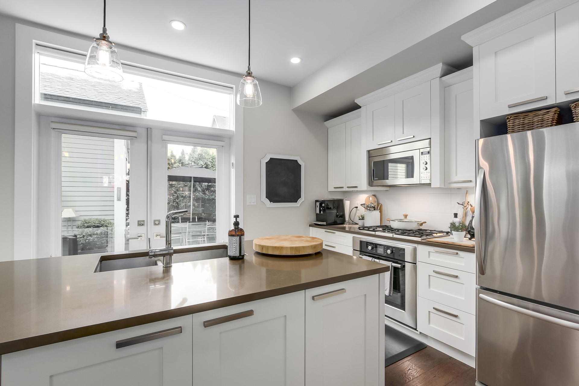 Main floor features bright and airy open plan living and dining room with center island Merit kitchen, Bosch stainless steel appliances, quartz counters, exposed fir beams, engineered hardwood floors and powder room.