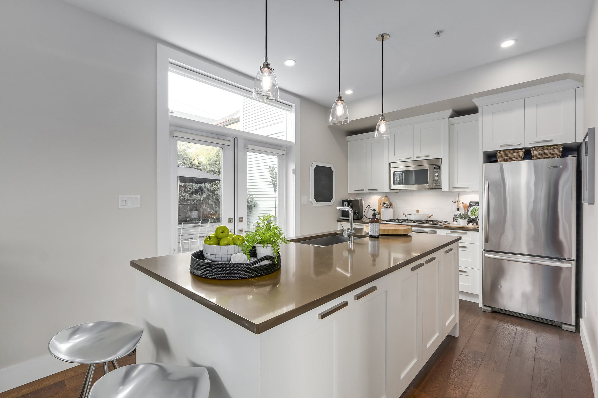 Live by design - beautifully presented half duplex just steps to "Garden Park" and a short stroll to Commercial Drive. Main floor features bright and airy open plan living and dining room with center island Merit kitchen, Bosch stainless steel appliances, quartz counters, expose
