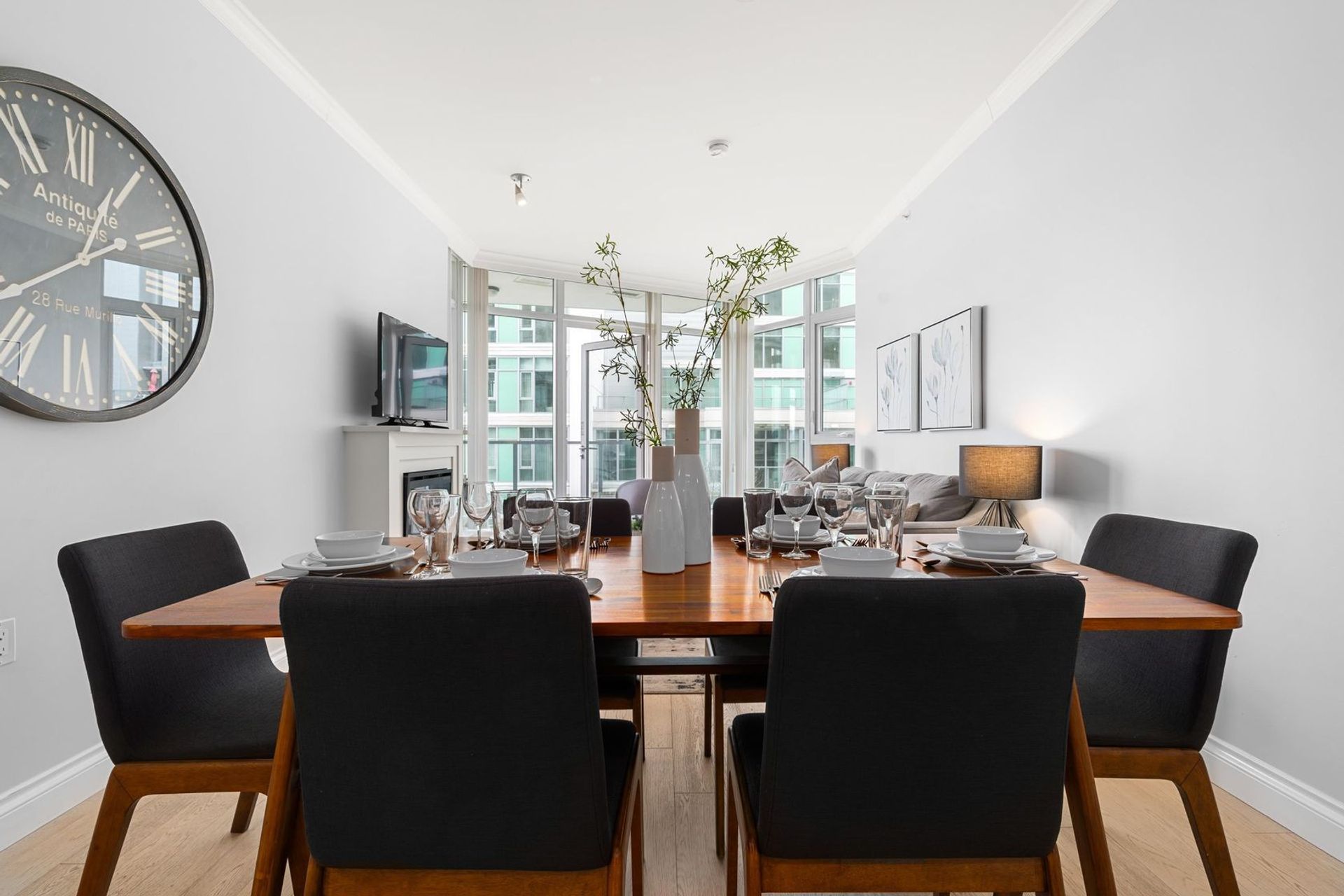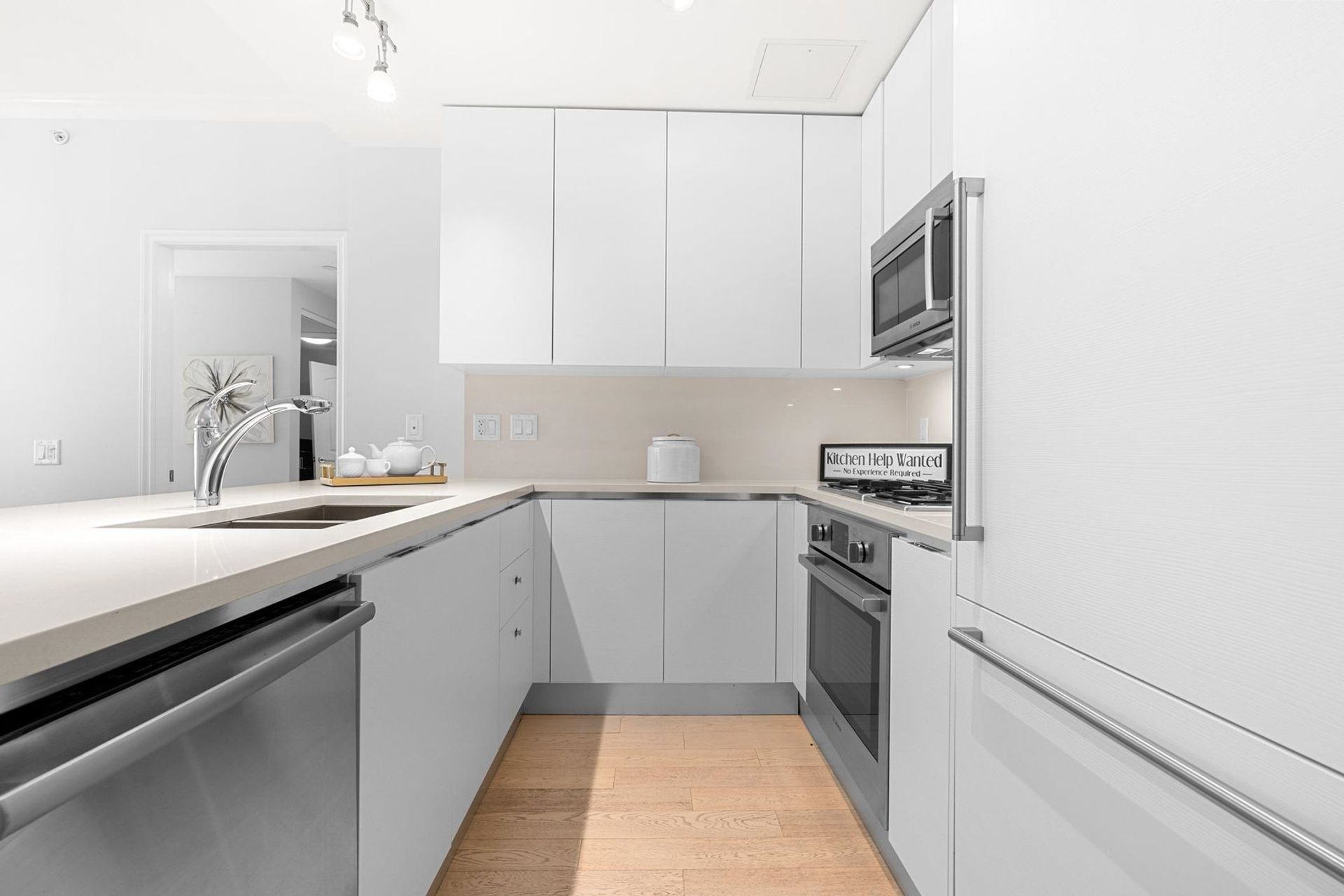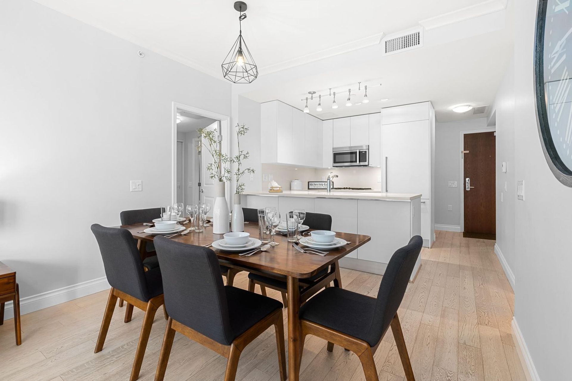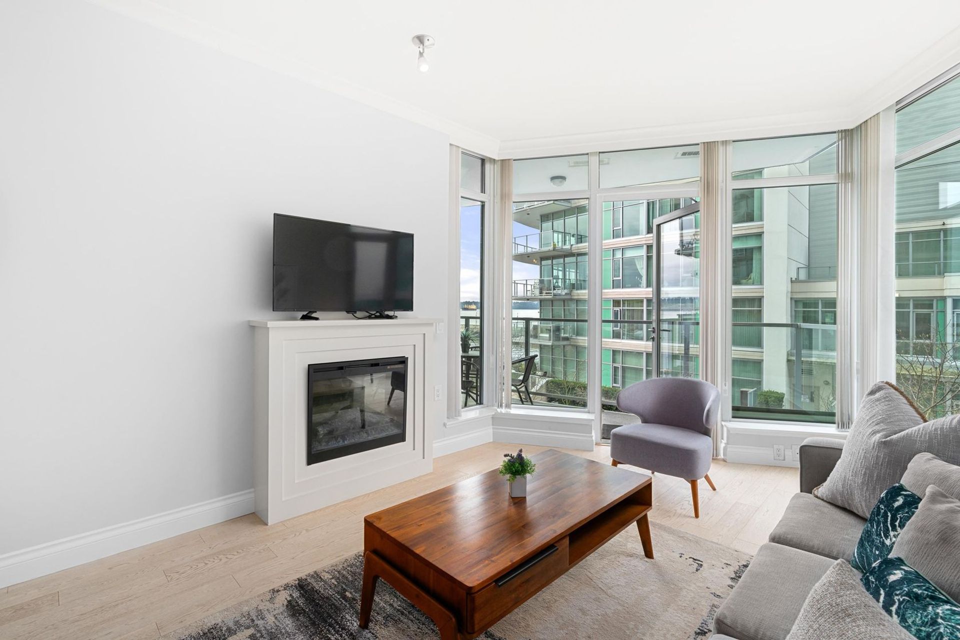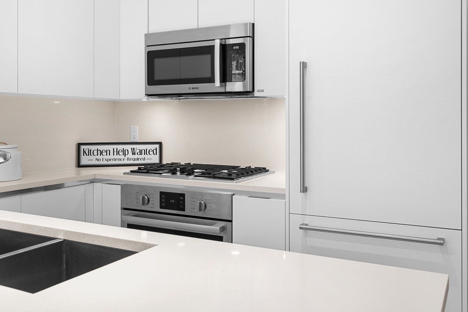 Over 1,000 sqft of luxury in the heart of Lower Lonsdale's Shipyard District.Step in and enjoy open concept living with full sized dining and living room, plus a gourmet kitchen with gas cooktop and integrated fridge.Soak in magnificent views of the Harbour and City each and every morning from your