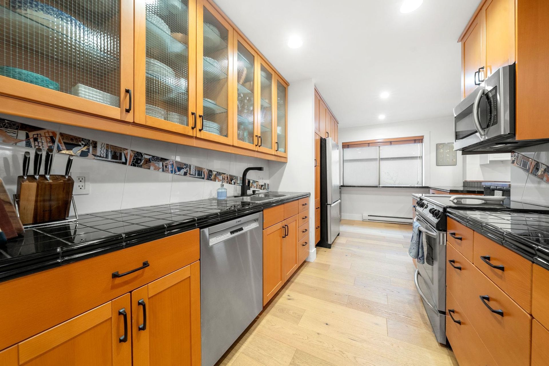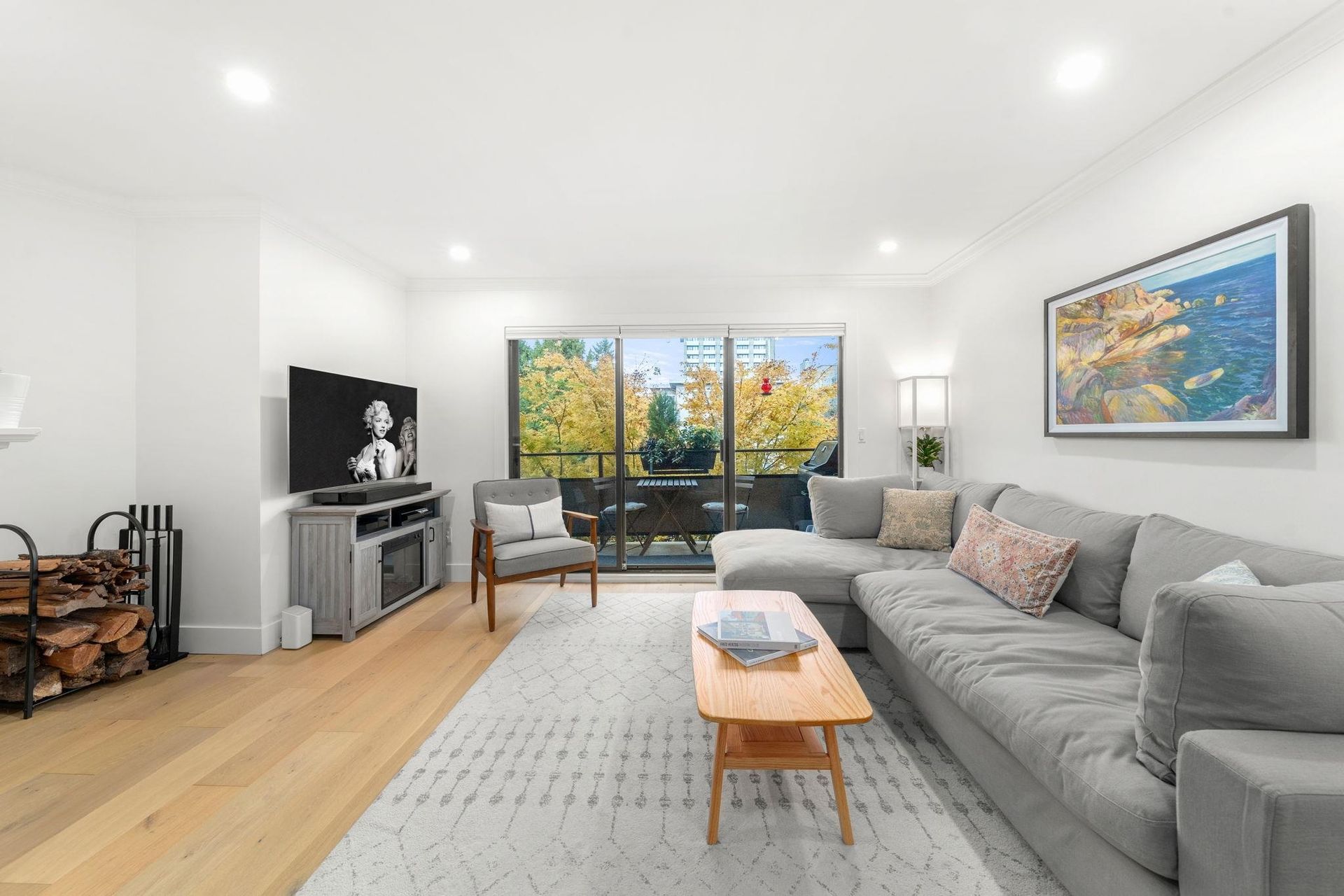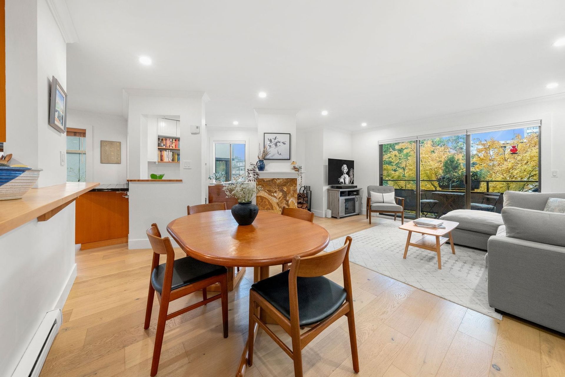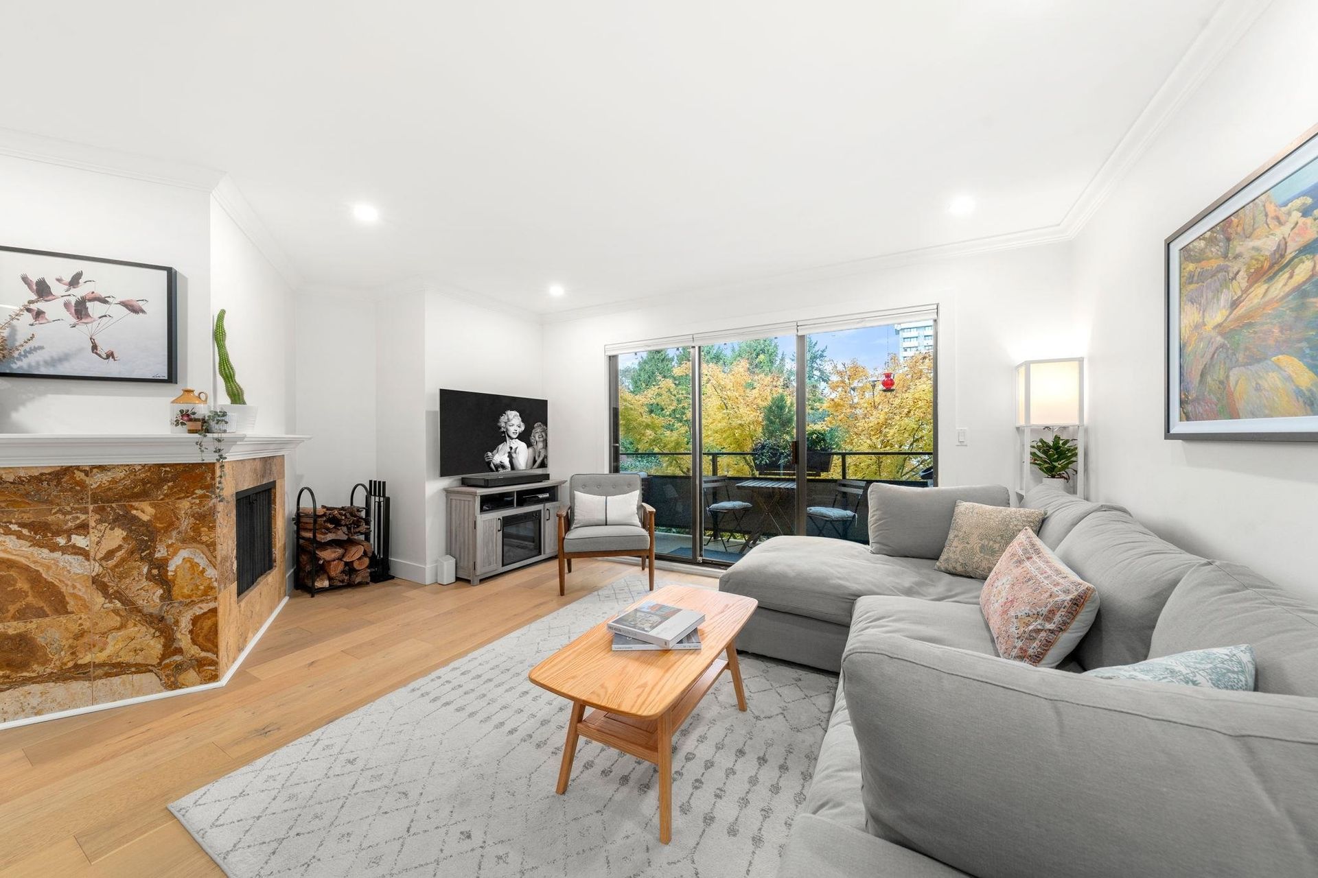 Small, 5 unit strata in a no fuss, easy maintenance building! Suite 201 occupies the entire front half of the floor, allowing for windows on 3 sides of the home. At nearly 1,200 sqft, there are zero compromises on space. The suite has been caringly updated and features wide plank Oak hardwood, updated lighting, blinds, paint and trim throughout. Enjoy open concept living and a large L shaped deck for summer evenings. Features include a dual-sided fireplace, cozy den, and large updated kitchen with coffee bar area. The bedrooms are spacious, including a primary with dual closets and a full ensuite. Tons of in suite storage, plus 2 external lockers and 1 parking. Pets allowed and in suite laundry allowed w/ strata approval. Roof recently replaced! Walking distance to future Broadway line and VGH!