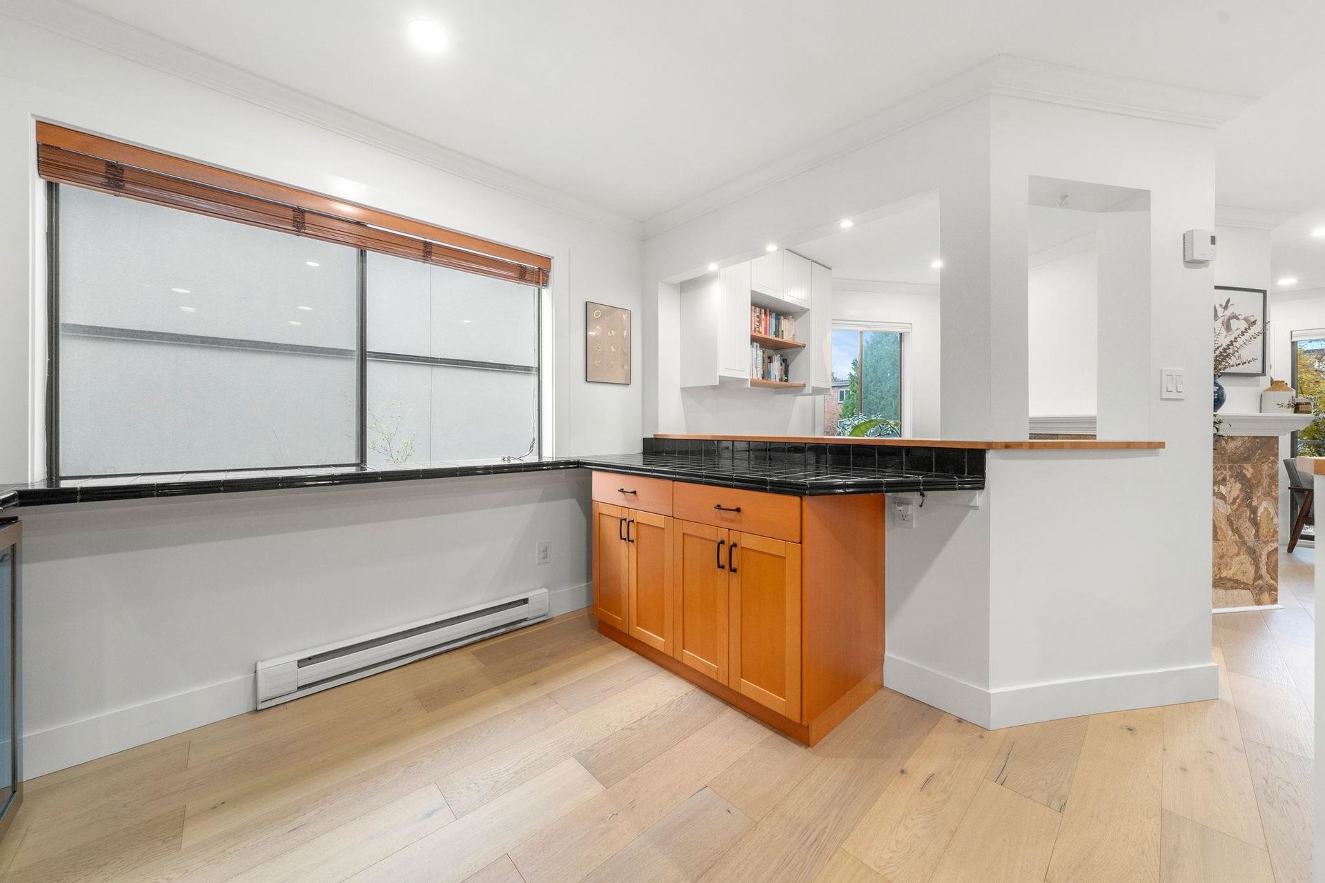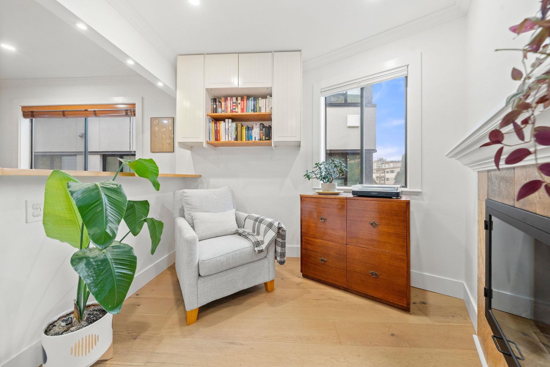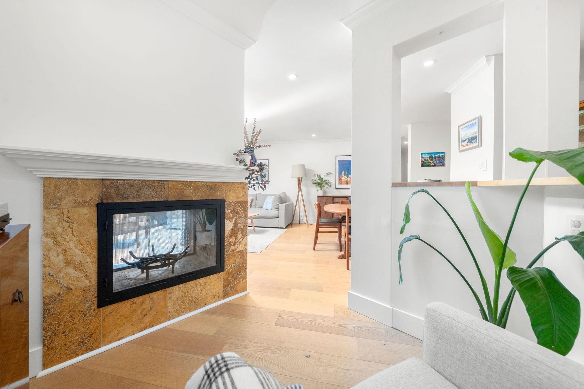 Boutique, 5 unit strata in a no fuss, easy maintenance building! Suite 201 occupies the entire front half of the floor, allowing for windows on 3 sides of the home. At nearly 1,200 sqft, there are zero compromises on space. The suite has been caringly updated and features wide plank Oak hardwood, updated lighting, blinds, paint and trim throughout. Enjoy open concept living and a large L shaped deck for summer evenings. Features include a dual-sided fireplace, cozy den, and large updated kitchen with coffee bar area. The bedrooms are spacious, including a primary with dual closets and a full ensuite. Tons of in suite storage, plus 2 external lockers and 1 parking. Pets allowed and in suite laundry allowed w/ strata approval. Roof recently replaced! Walking distance to future Broadway line and VGH!