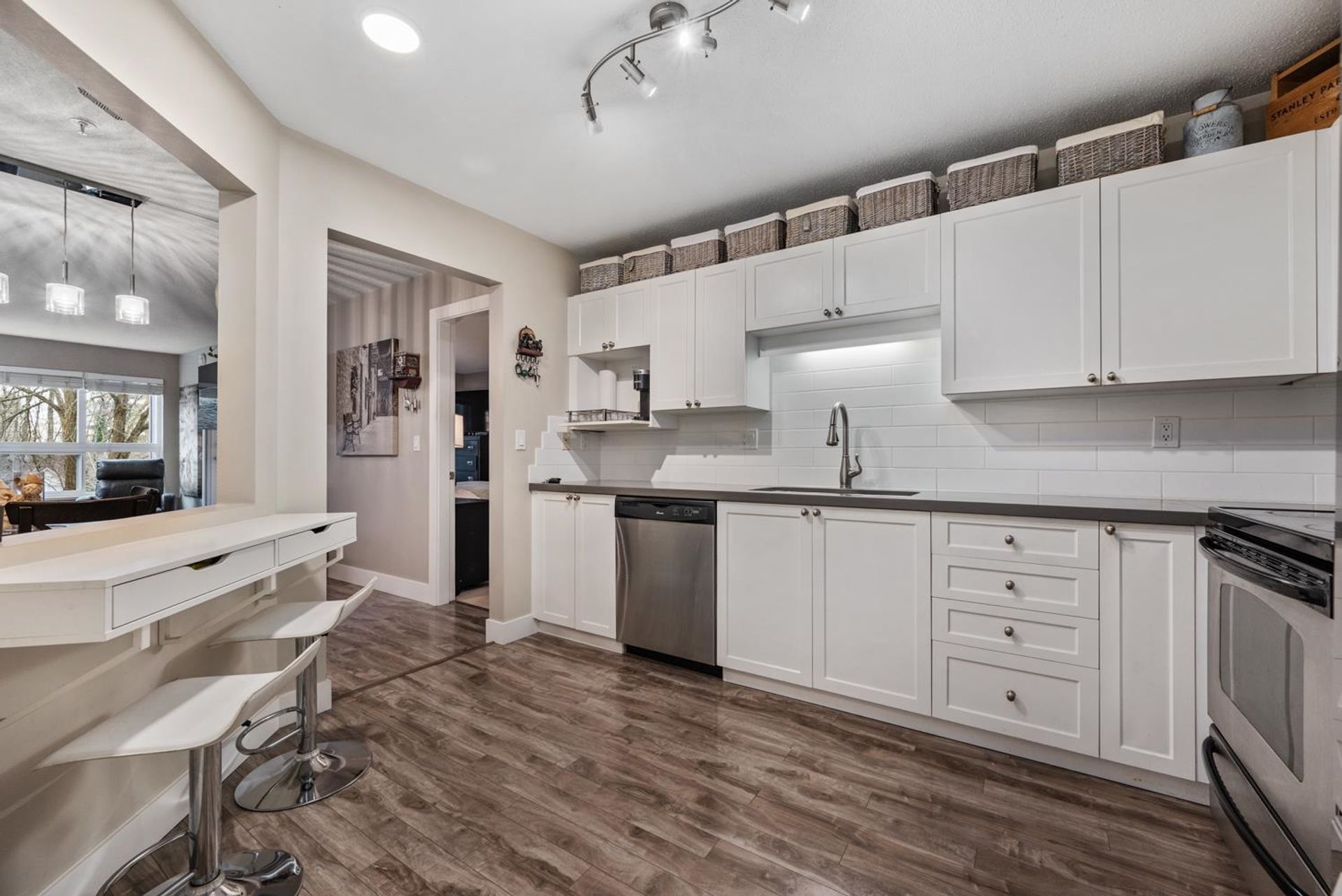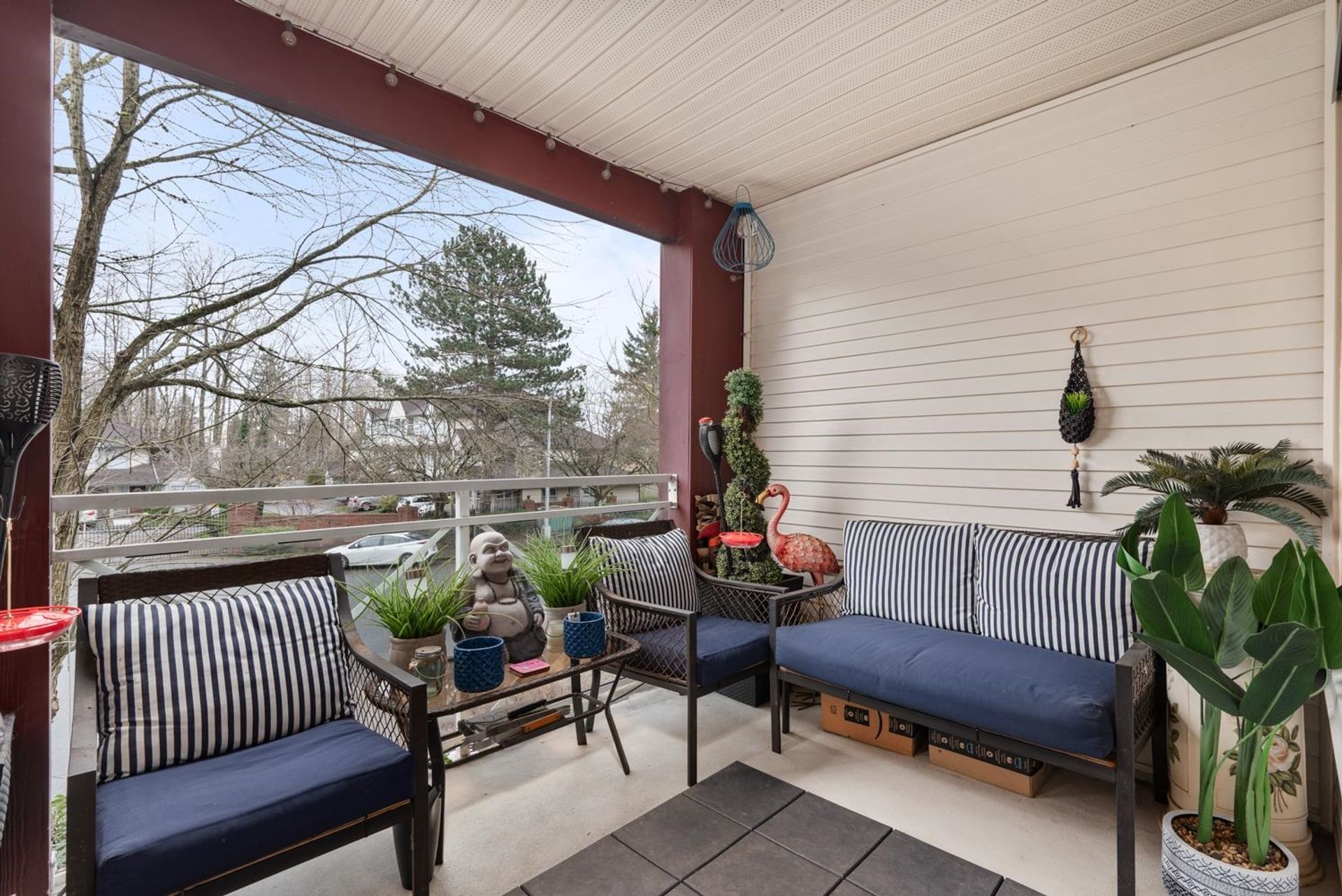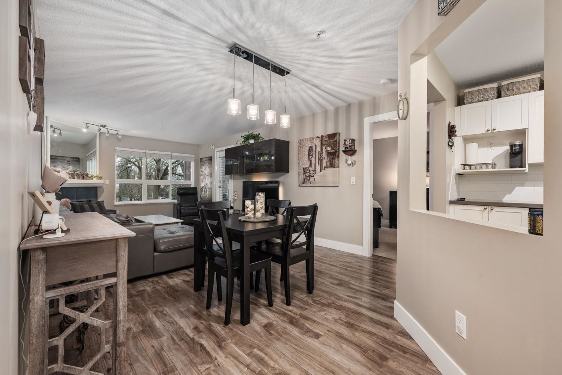 Prime central location! Bright and spacious 2-bedroom, 2-bath condo featuring an open floor plan, cozy gas fireplace, and a covered balcony overlooking a peaceful setting. The primary bedroom includes a walk-in closet, while the second bedroom is conveniently situated next to a full bathroom with a standing shower. Updated kitchen with newer appliances and a window for natural light. Light laminate flooring throughout and in-suite laundry. Well-managed 4-storey building within walking distance of shops, restaurants, medical offices, schools, Scott Road Centre Mall, and transit. Includes 2 parking stalls and a storage locker. Building amenities include a clubhouse, workshop, and bike room. Pet-friendly.