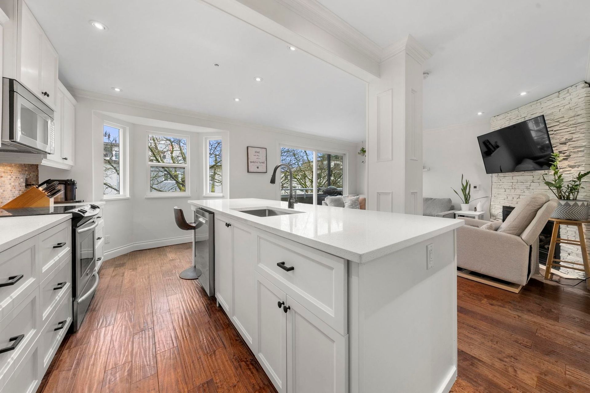 Unique 2 level townhouse style apartment in the heart of Fairview. Truly a 1-of-1 layout, this is the only 2 level suite in the building and there are no other units above you. Boutique, self managed strata with low fees, this renovated home features a huge kitchen with loads of storage and a massive island with built in dining. The living room features a warm gas fireplace, bay windows, powder room and a covered deck. Eastern facing, with a pleasant outlook, the home gets lovely light streaming through. Upstairs are 2 generous bedrooms, including a primary with king bed, sitting bay window and walk-in-closet; plus a fully remodeled bathroom and in suite laundry. 1 secure parking, storage area, cats and dogs welcome. Exceedingly well cared for and updated home - just move in and enjoy.